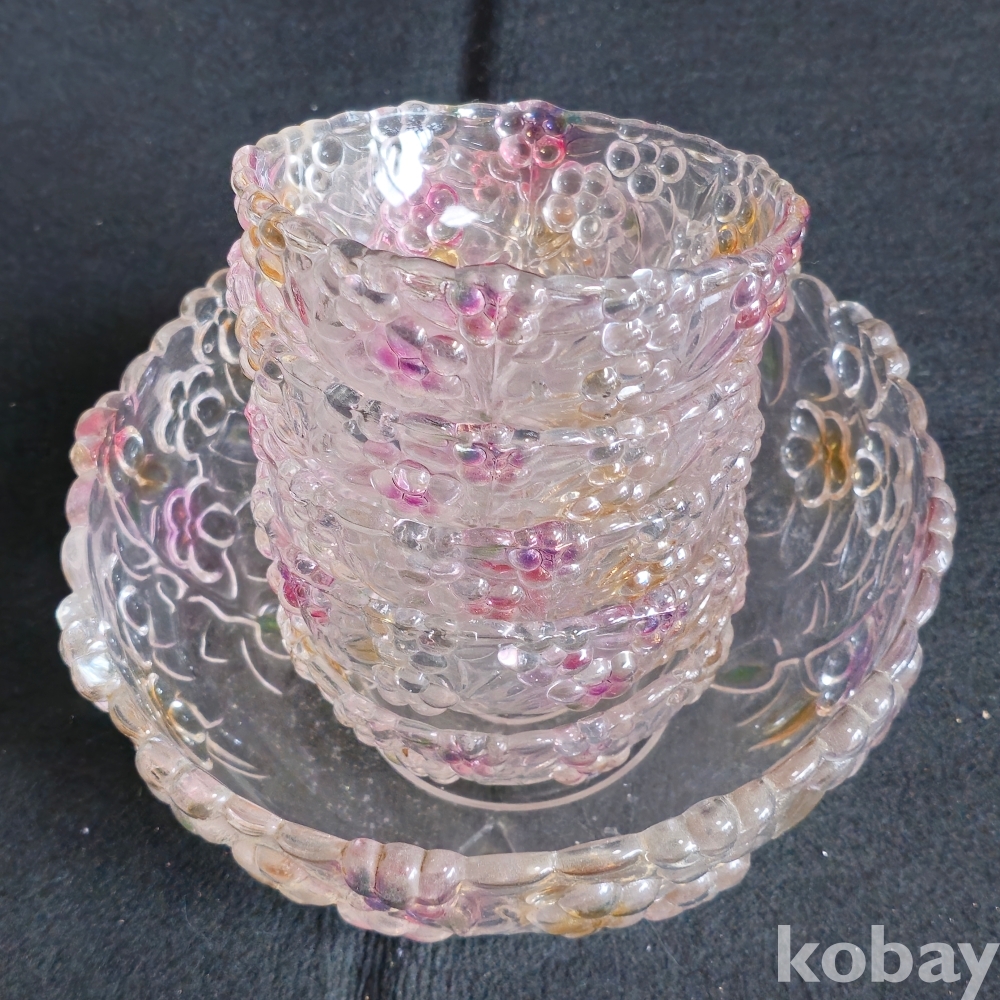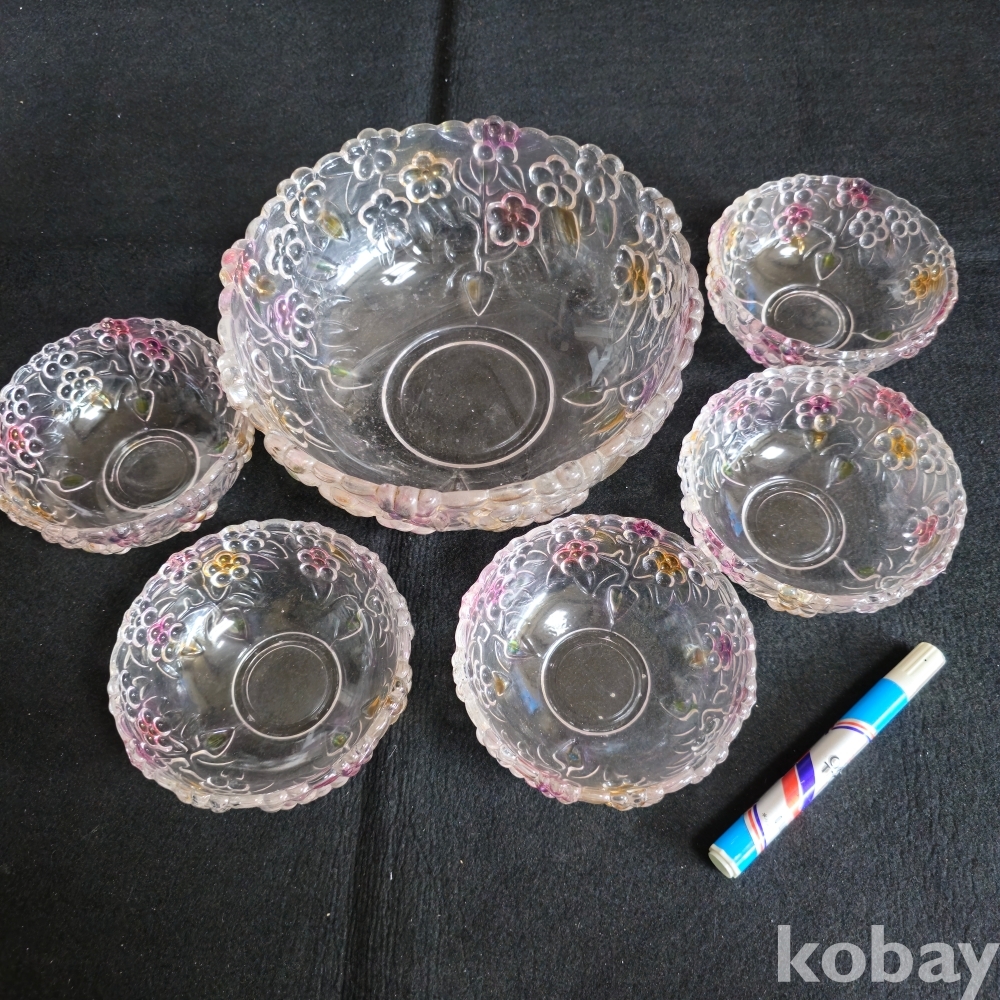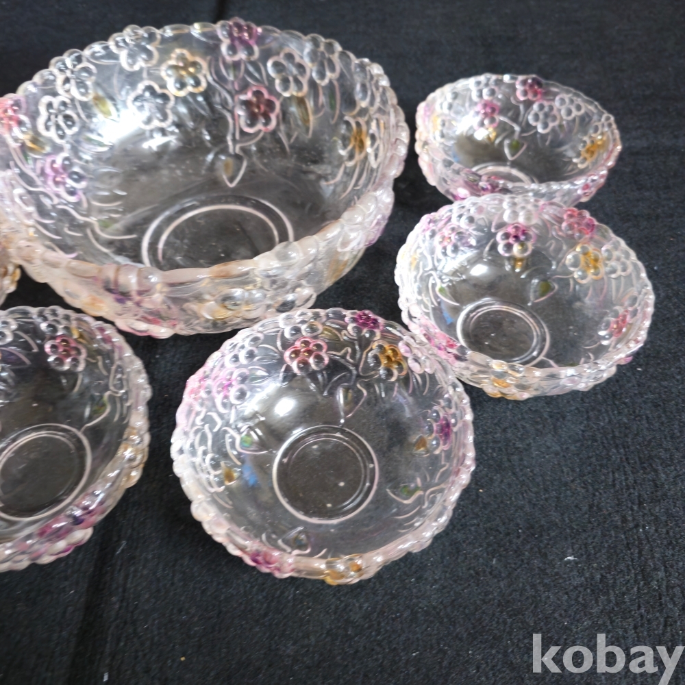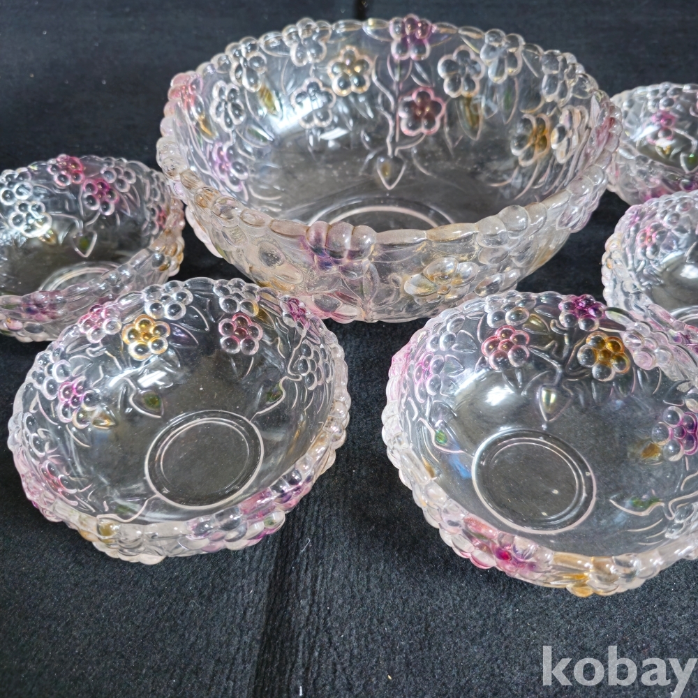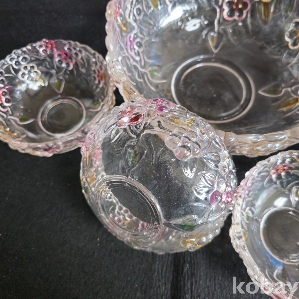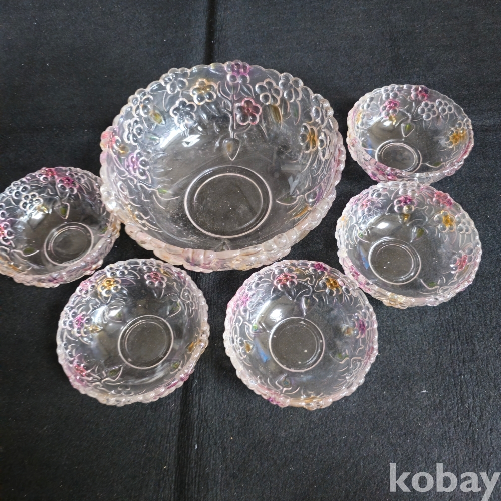 (((근현대사자료))) 1980년대 꽃무늬 양각 화채볼과 식기 5개