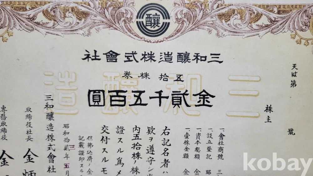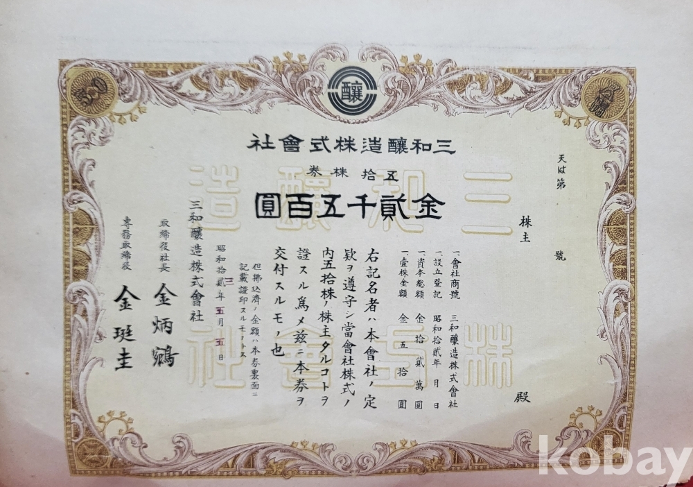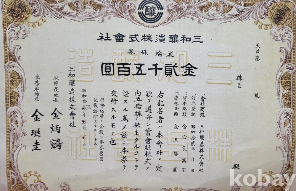 1938년 (소화12 년) 삼화양조 주식회사 주식증서 진본입니다,
