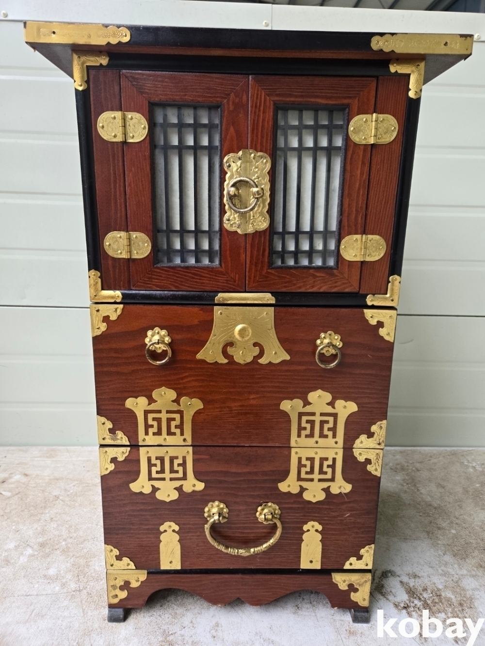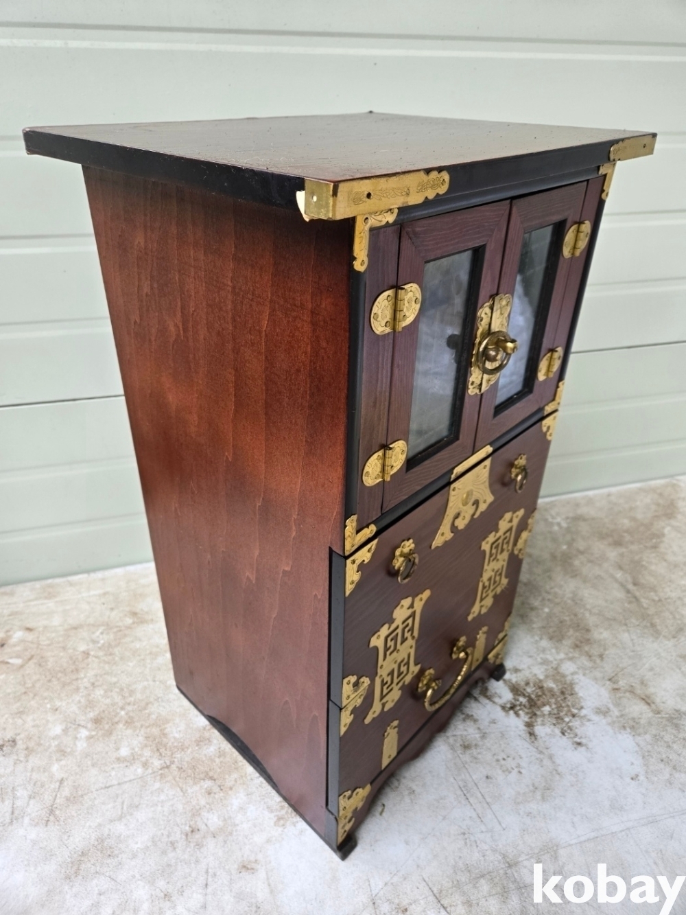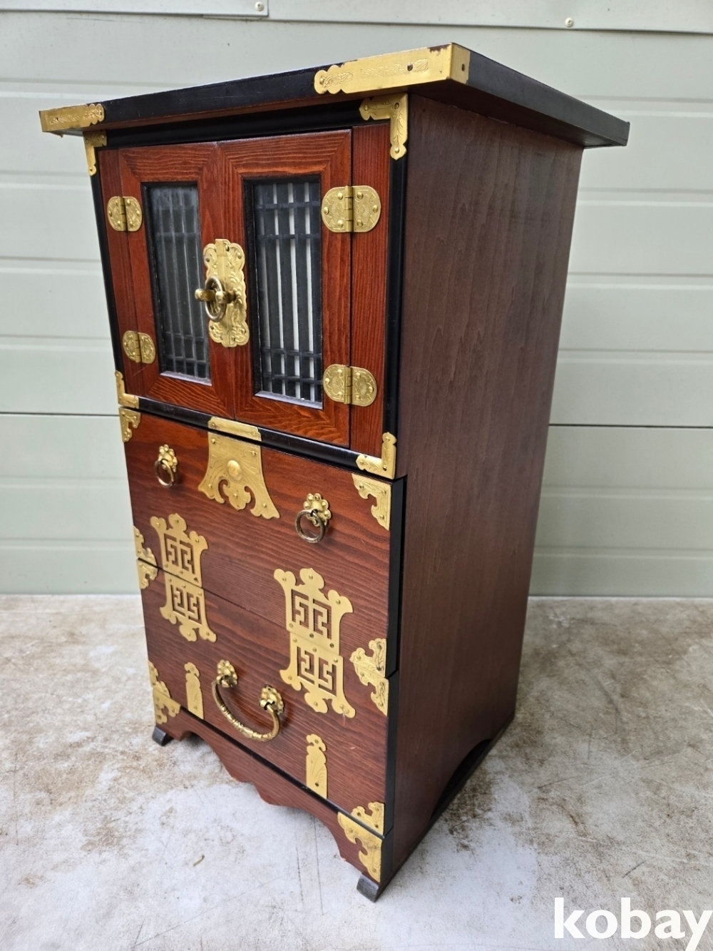 동 장식에 앞닫이, 2칸의 서랍이 있는 장식장 입니다.