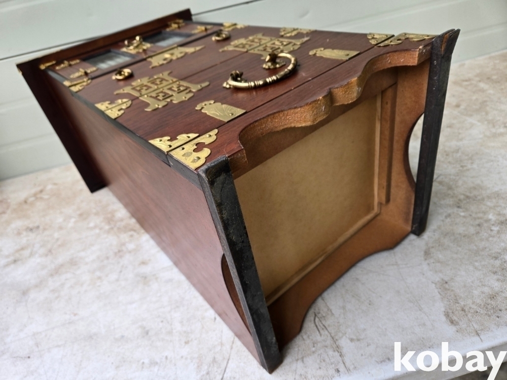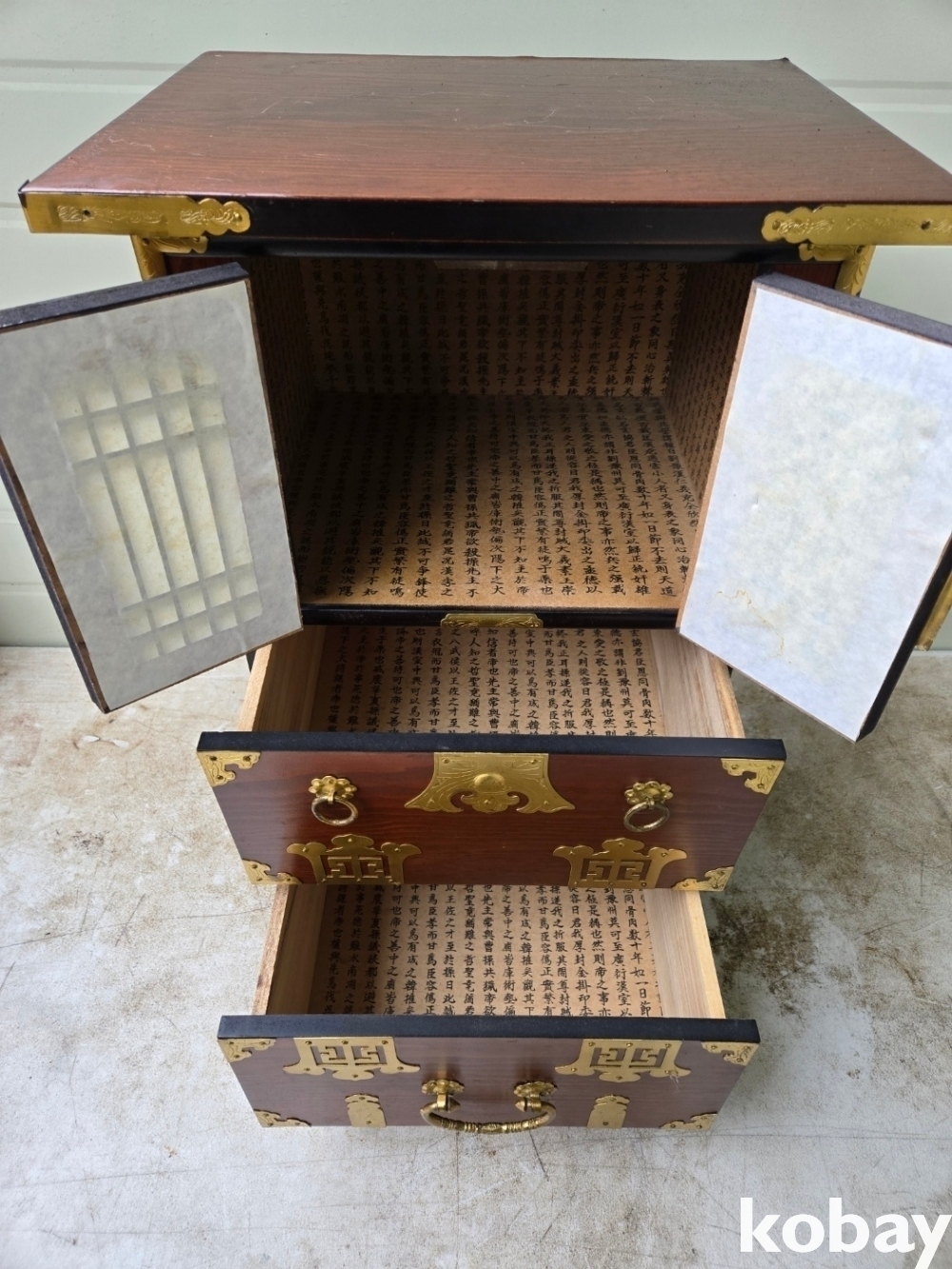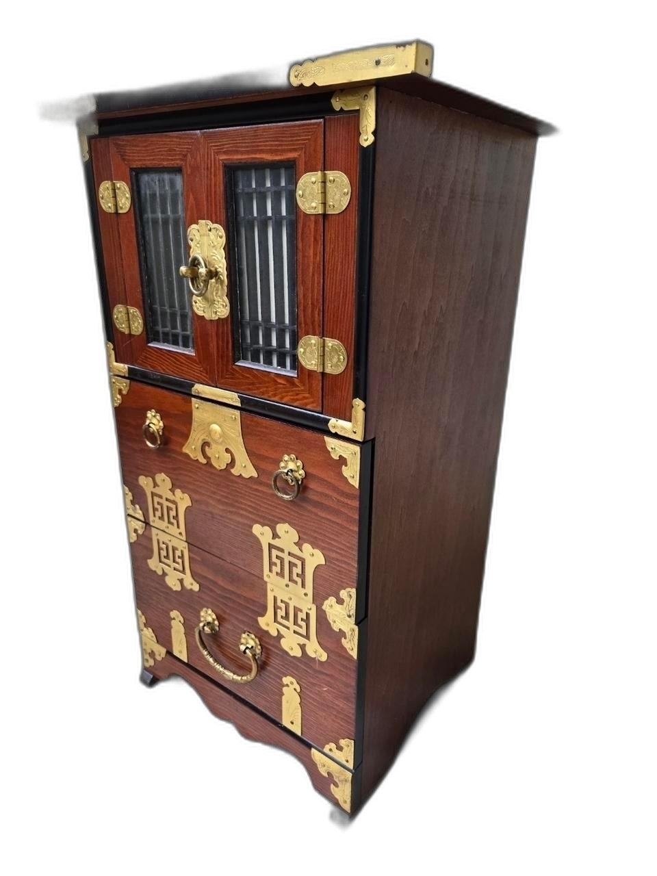 동 장식에 앞닫이, 2칸의 서랍이 있는 장식장 입니다.