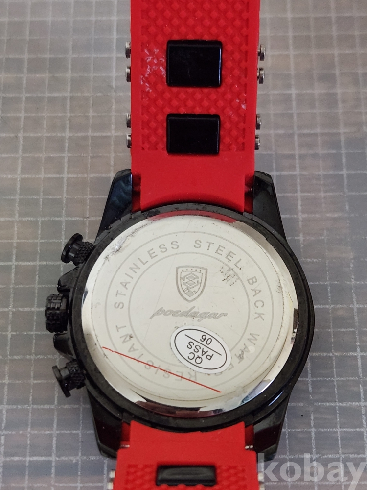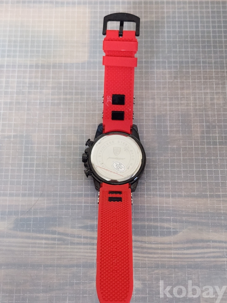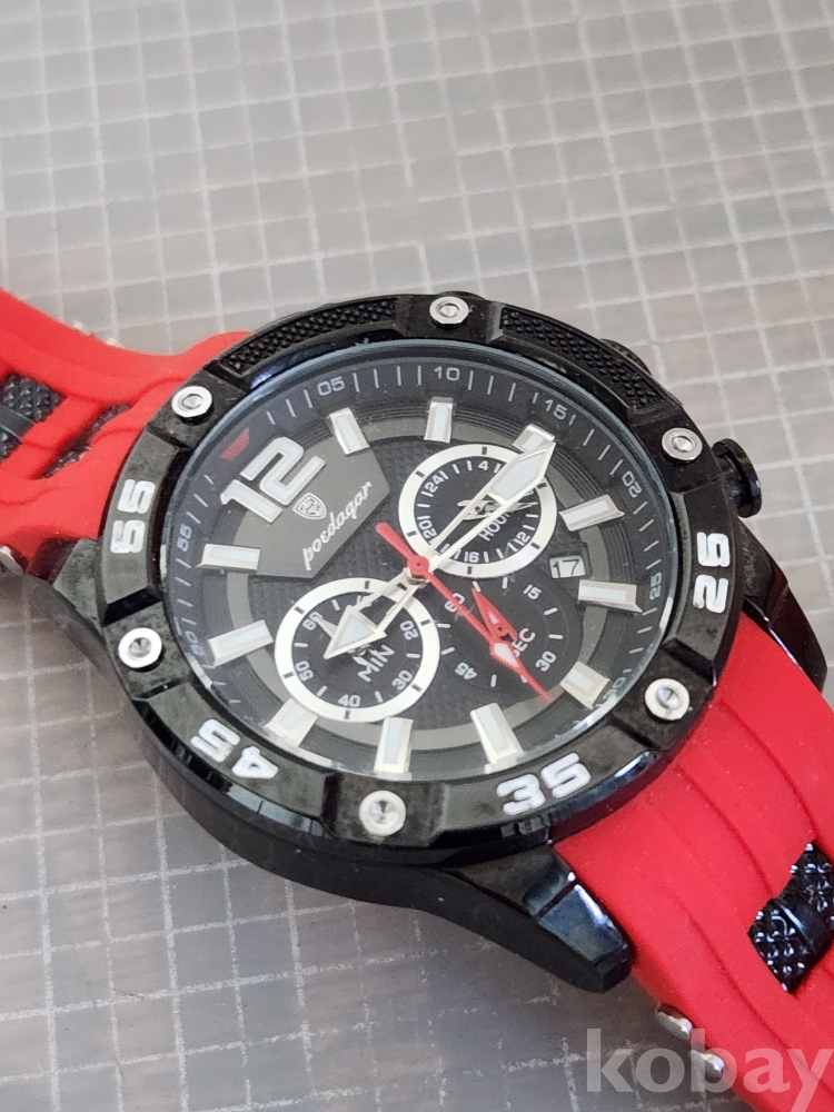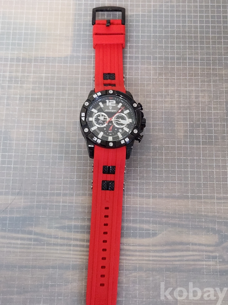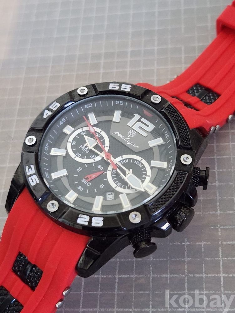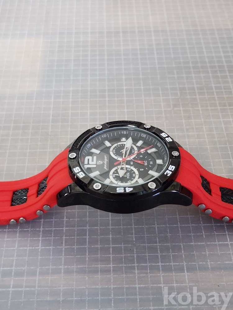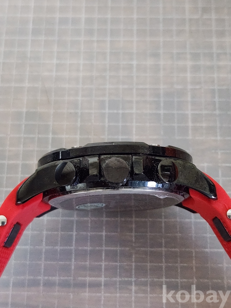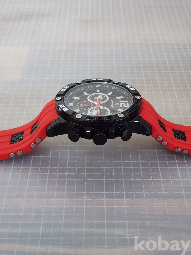 빨간색 실리콘 밴드와 검은색 베젤이 스포티한 느낌을 줍니다