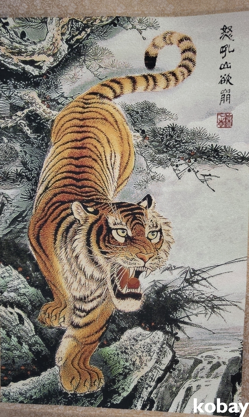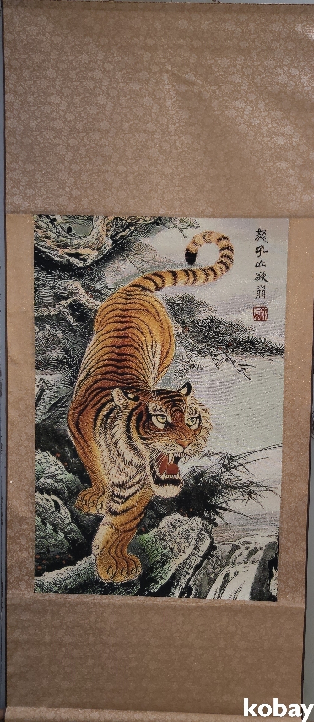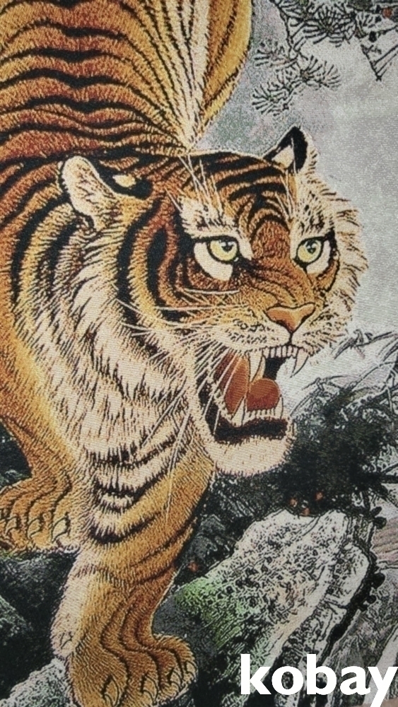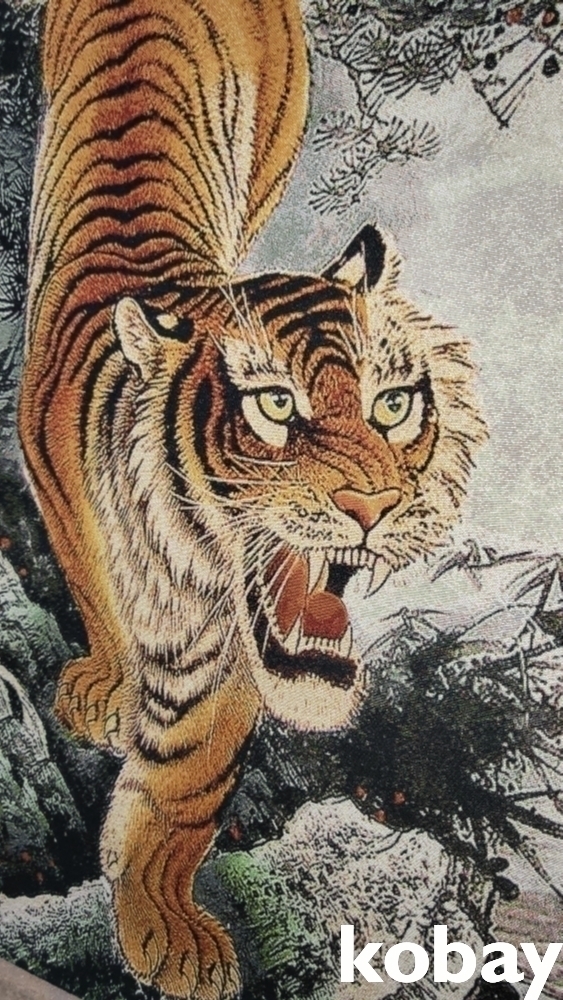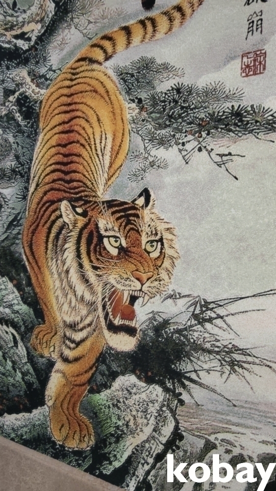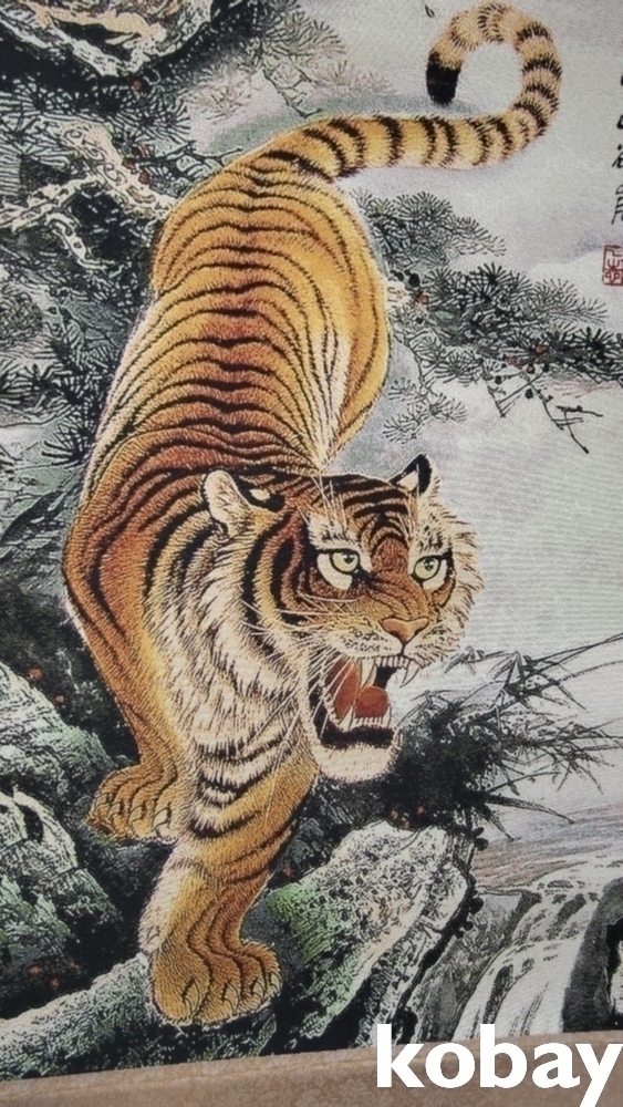 특별하고 두터운 천바닥 위에 호랑이 족자입니다,