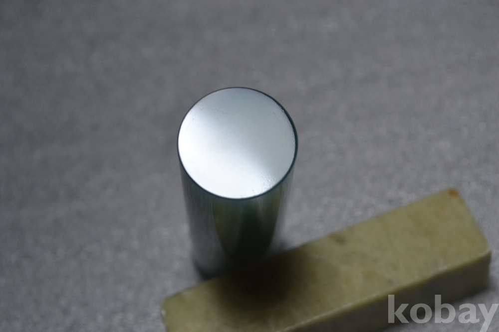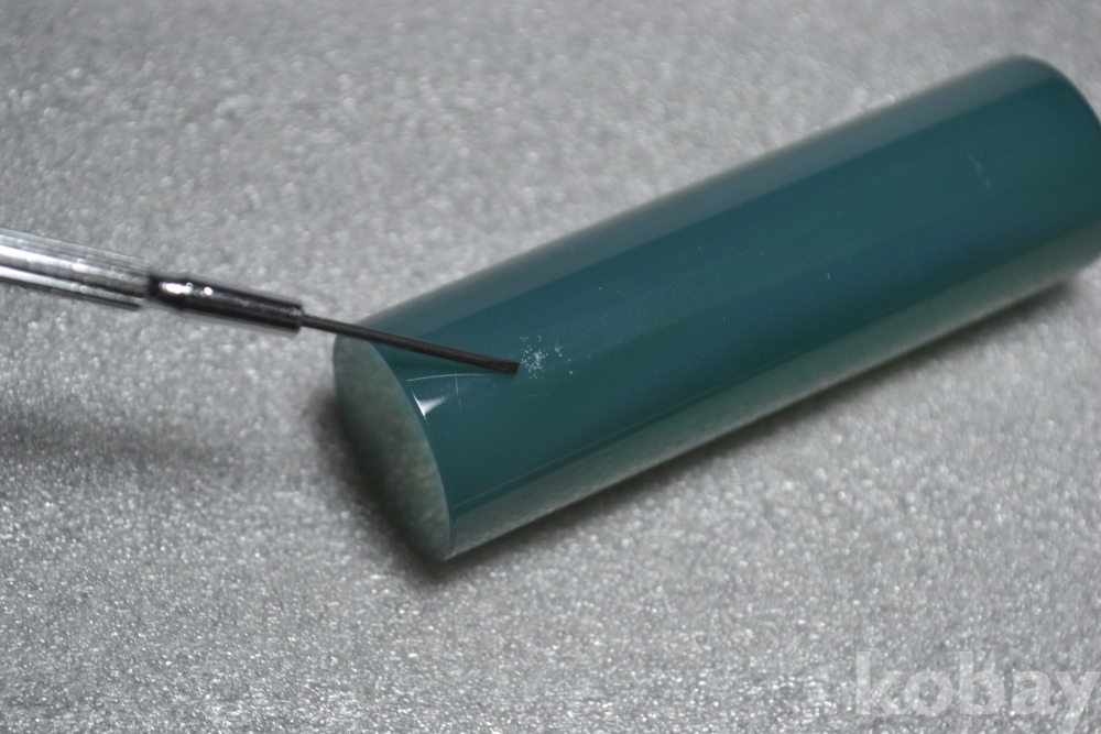 녹마노 도장의 몸체 표면부분을 보시면 2곳정도 미세한 이물질이 표면에 묻어있는 부분이 보입니다. (검은핀으로 가르킨 부분 2번째, 3번째 사진참조)