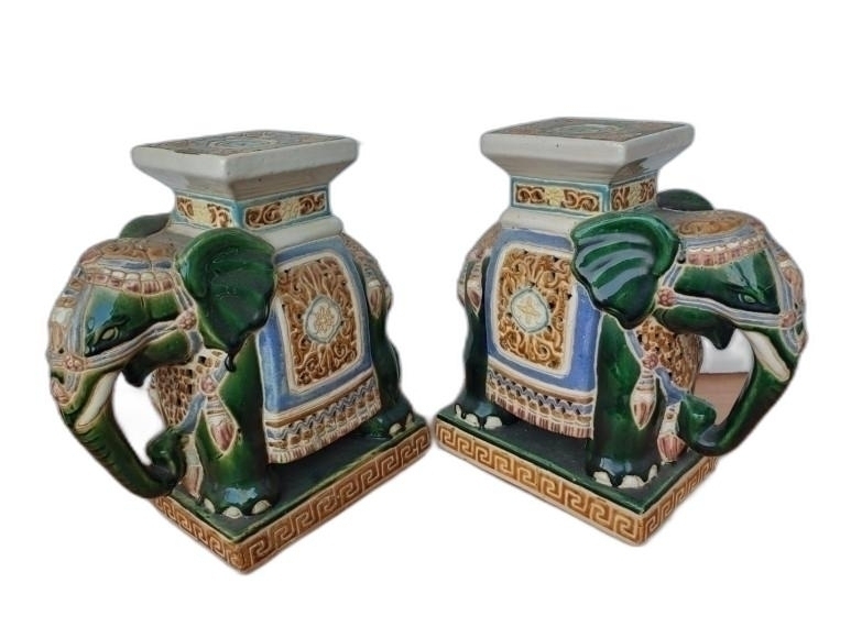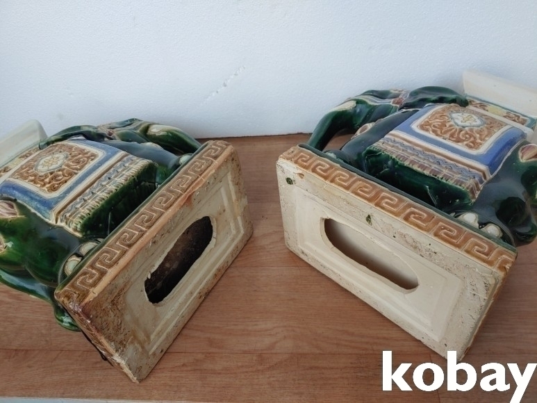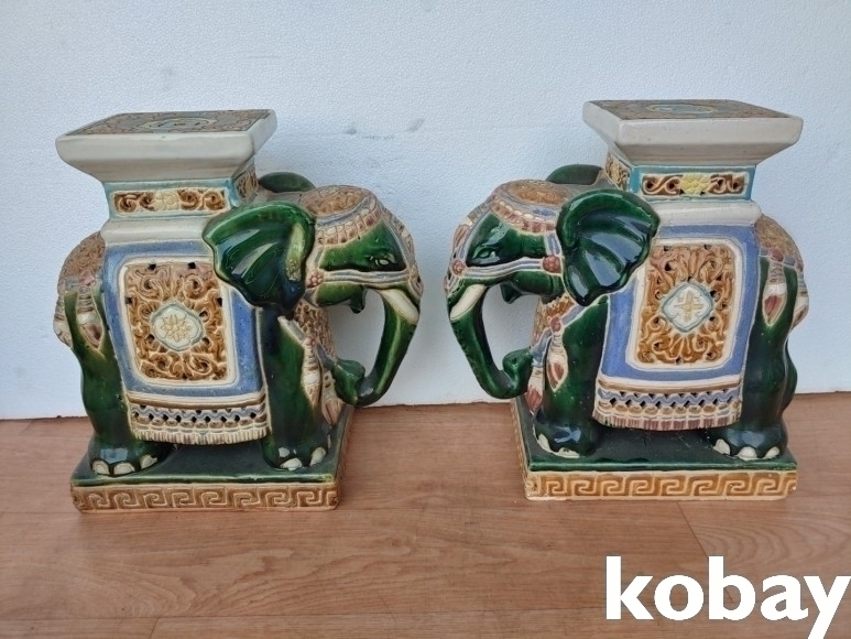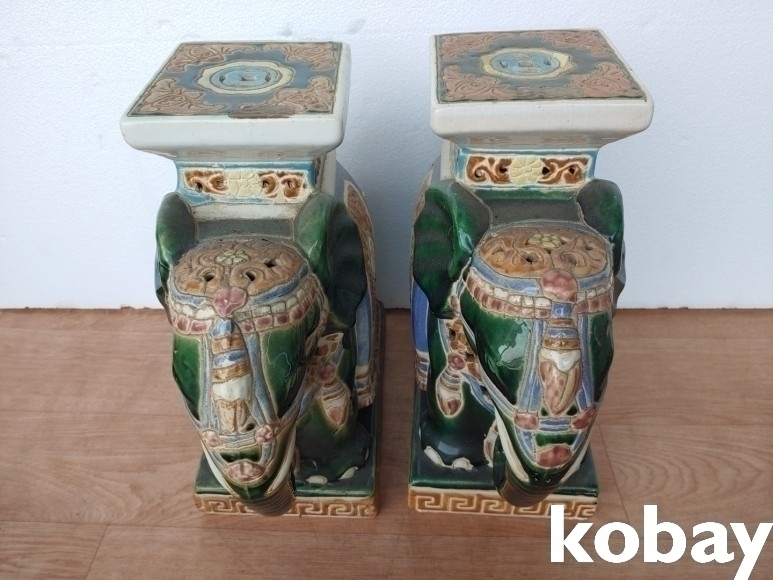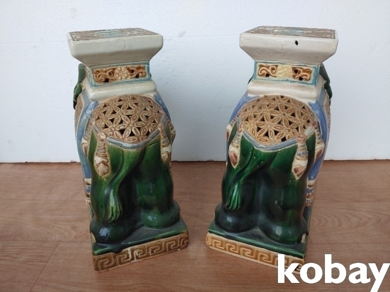 몸통 장식에 투각으로 멋을 낸 코끼리 도자기 2개 입니다.
