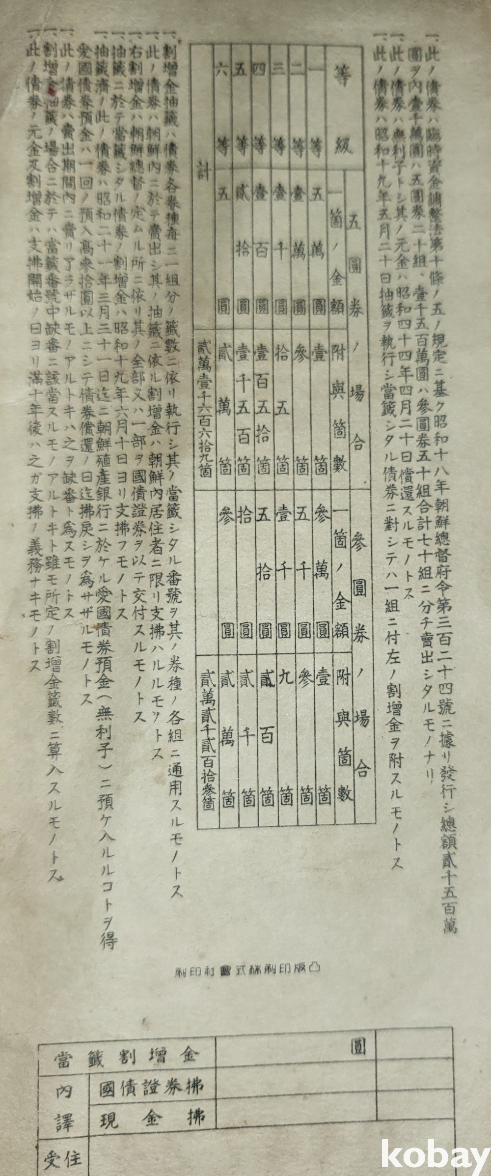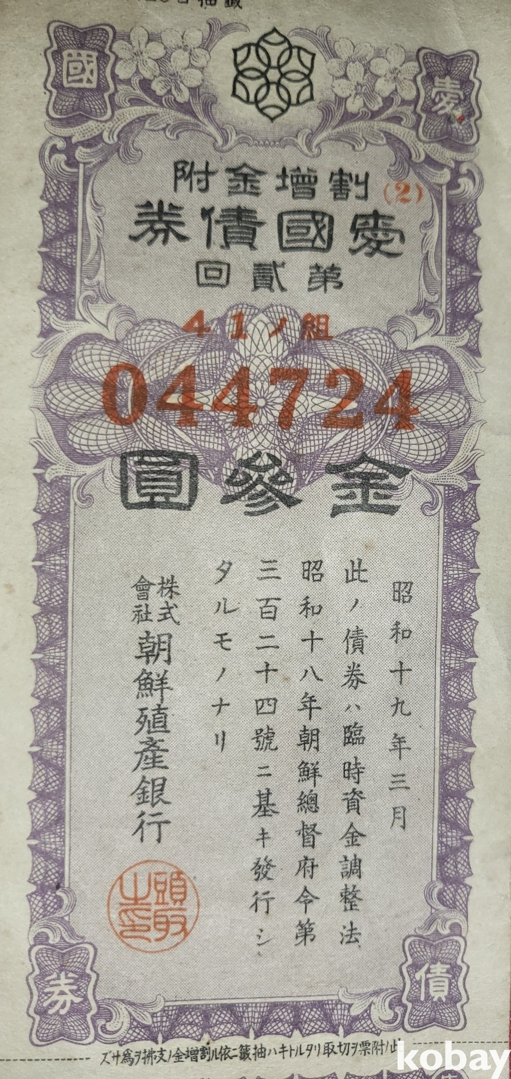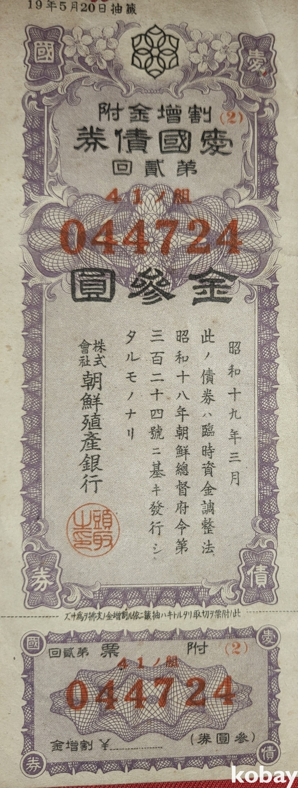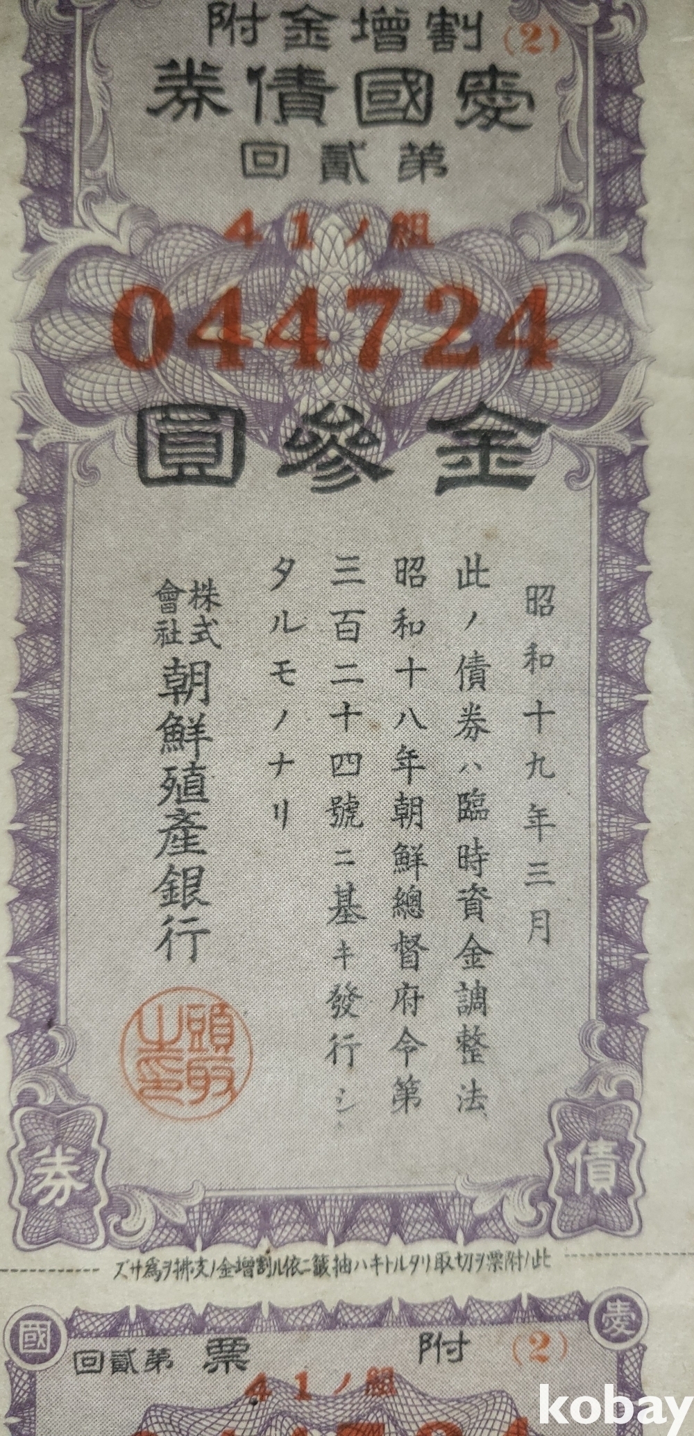 090ㅡ11호 하나우측번 ///// 주식회사 조선 직산은행 소하19년(1943년) 발행된 할증금부(割增金附)입니다,