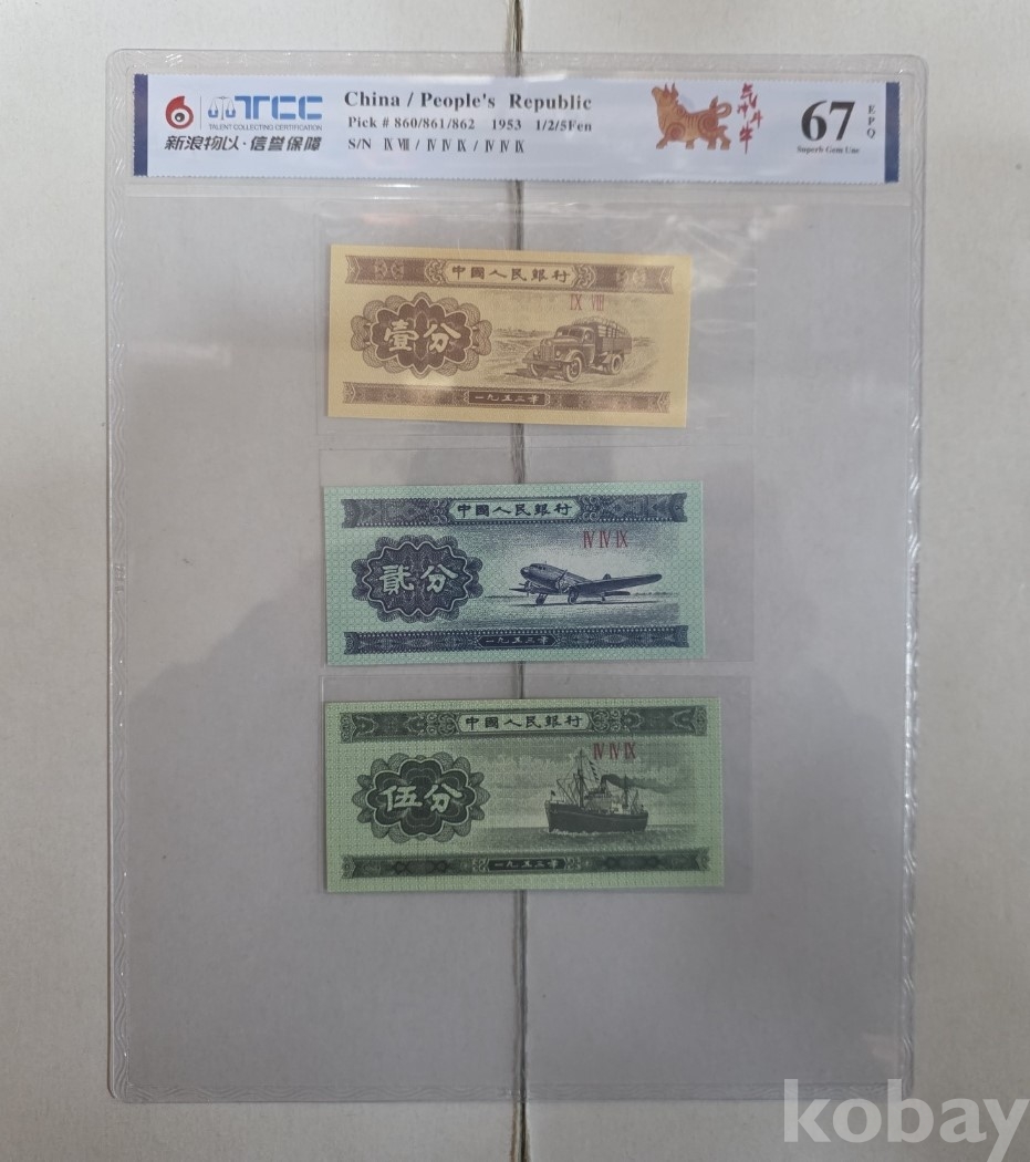 -1953년 중국 소액보조 분권 5, 2, 1분 3종 지폐 TCC67 고등급 입니다.