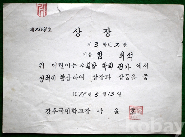 (상장 및 졸업장) 1977년 강후국민학교의 상장 - 학력평가...