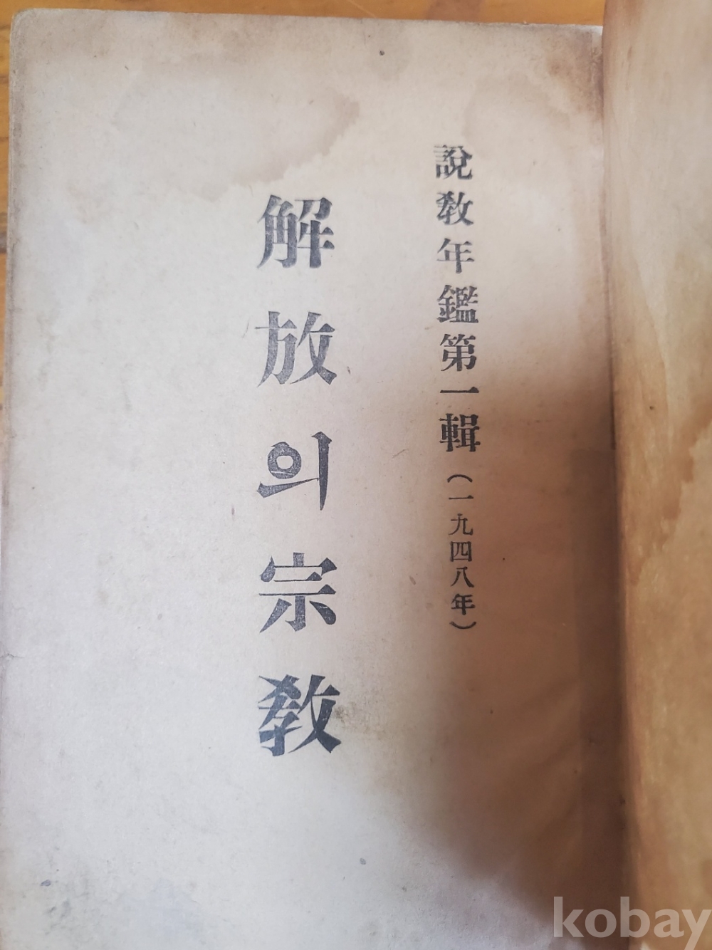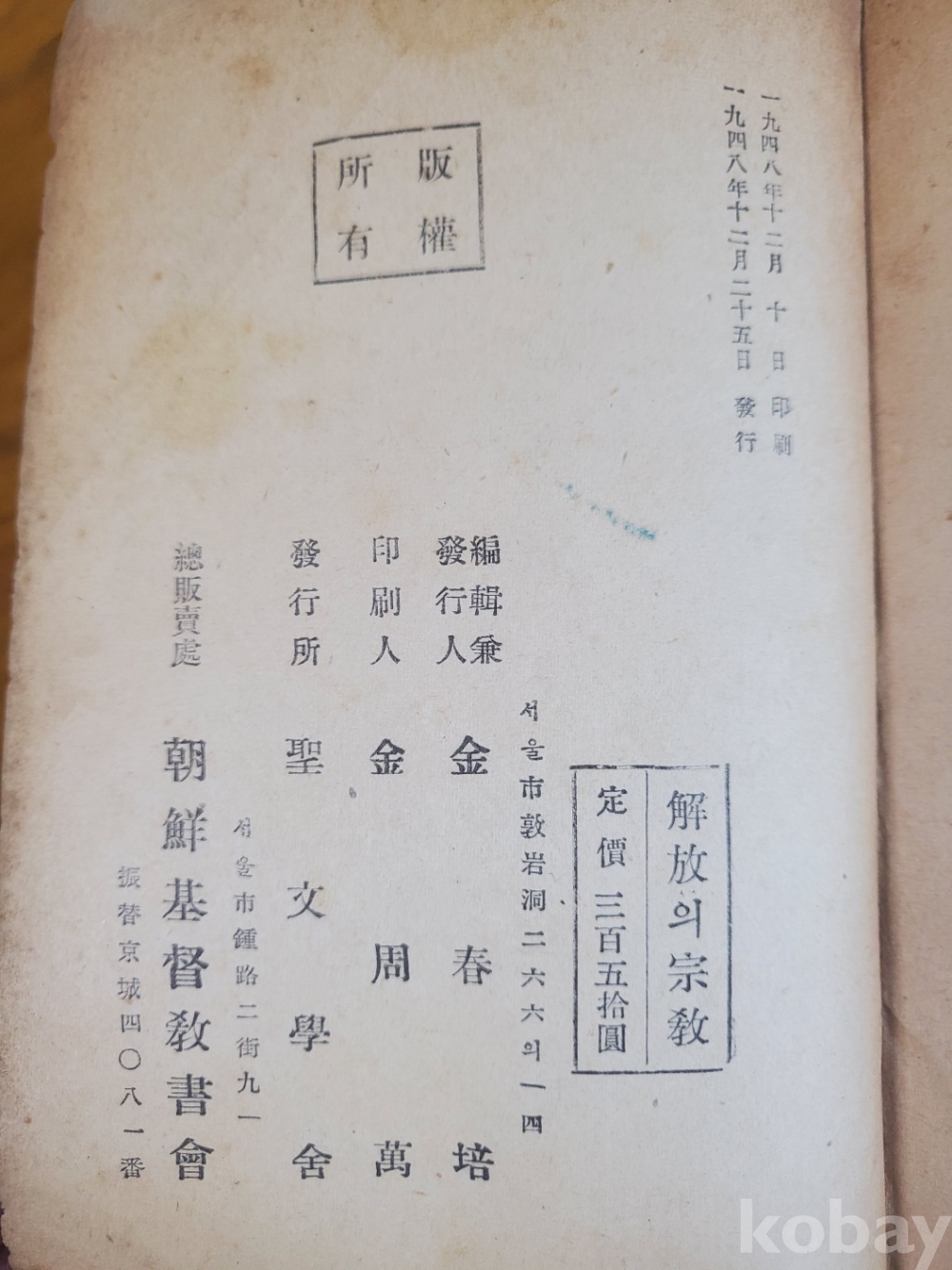 1. 해방의 종교, 성문학사, 1948년, 262쪽, 상태 상, 사진 참조