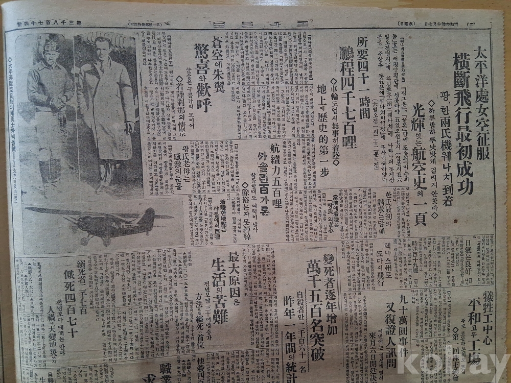 *太平洋處女空征服 橫斷飛行最初成功「팡」,「한」兩氏機「웨나치」到着 光輝잇는 航空史의 一頁~ (대서양 횡단 항공의 초기 성공을 기념하는 내용)