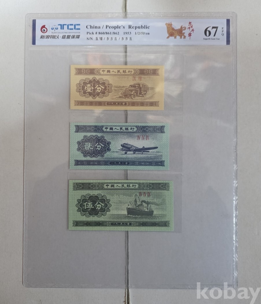 -1953년 중국 소액보조 분권 5, 2, 1분 3종 지폐 TCC67 고등급 입니다.