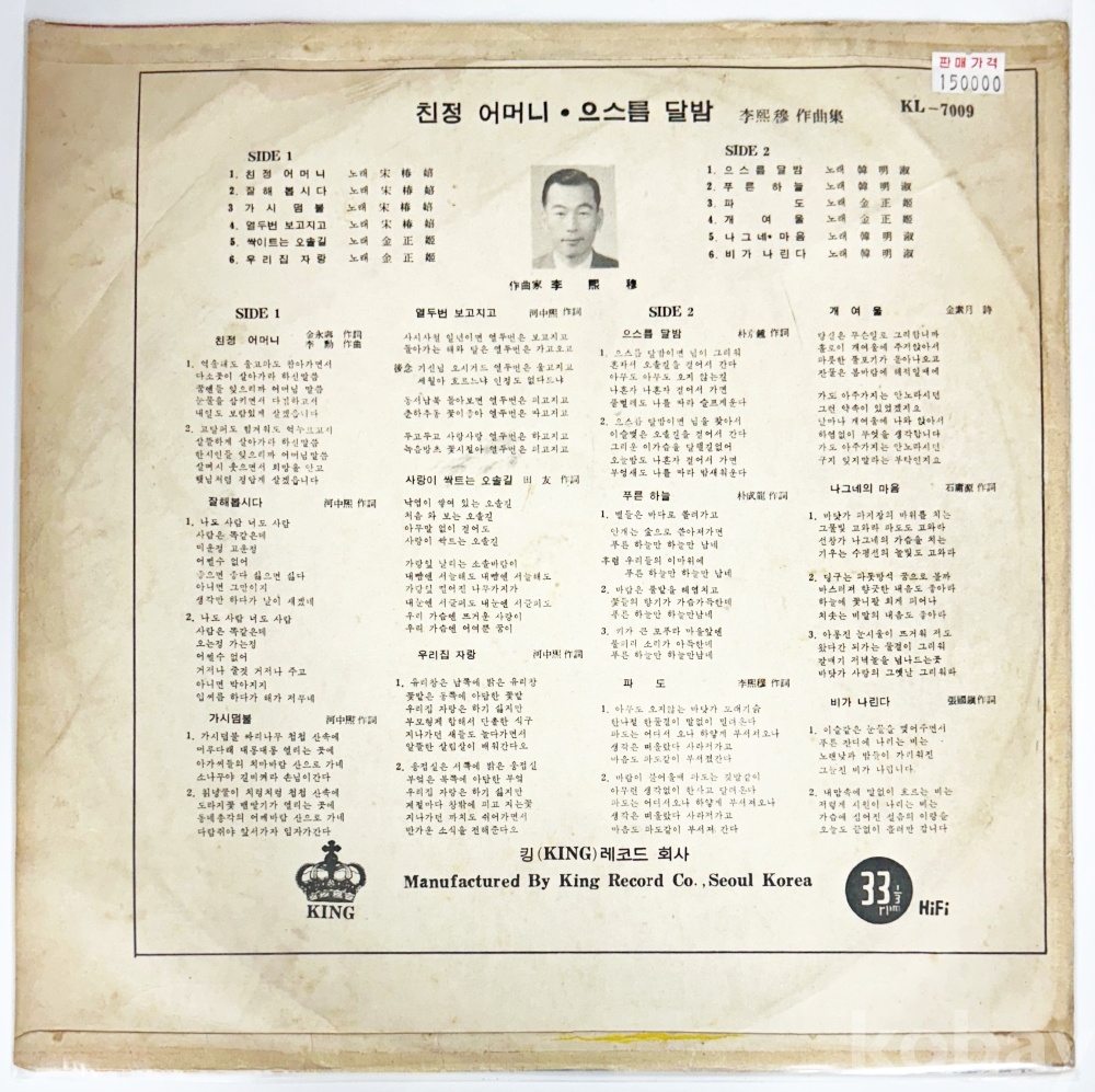 상품 설명 | Side A 1. 친정 어머니 2. 잘해 봅시다 3. 가시 덤블 4. 열두번 보고지고 5. 싹이트는 오솔길 6. 우리집 자랑 Side B 1. 으스름 달밤 2. 푸른 하늘 3. 파도 4. 개여울 5. 나그네 마음 6. 비가 나린다 ※ 정미조의 대표곡 개여울, 파도의 오리지널 버전을 수록한 김정희의 음반이 포함되어있습니다. | ||