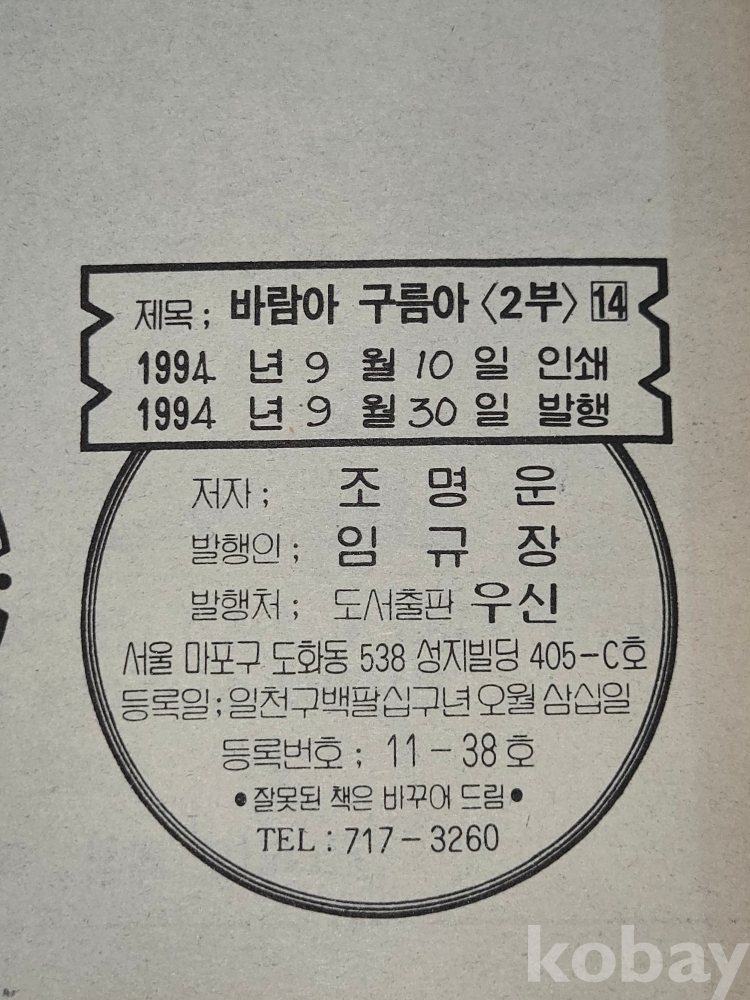 80-90년대 만화방 == 특선대하극화 == 조명운 글.그림 == 바람아구름아 14권 완질