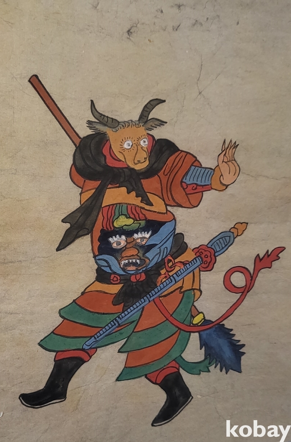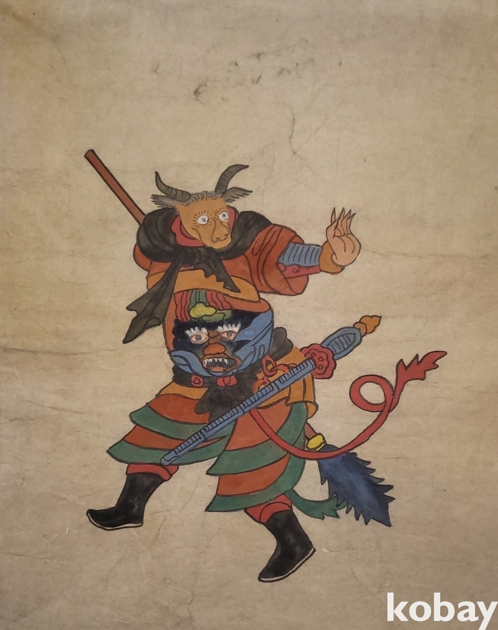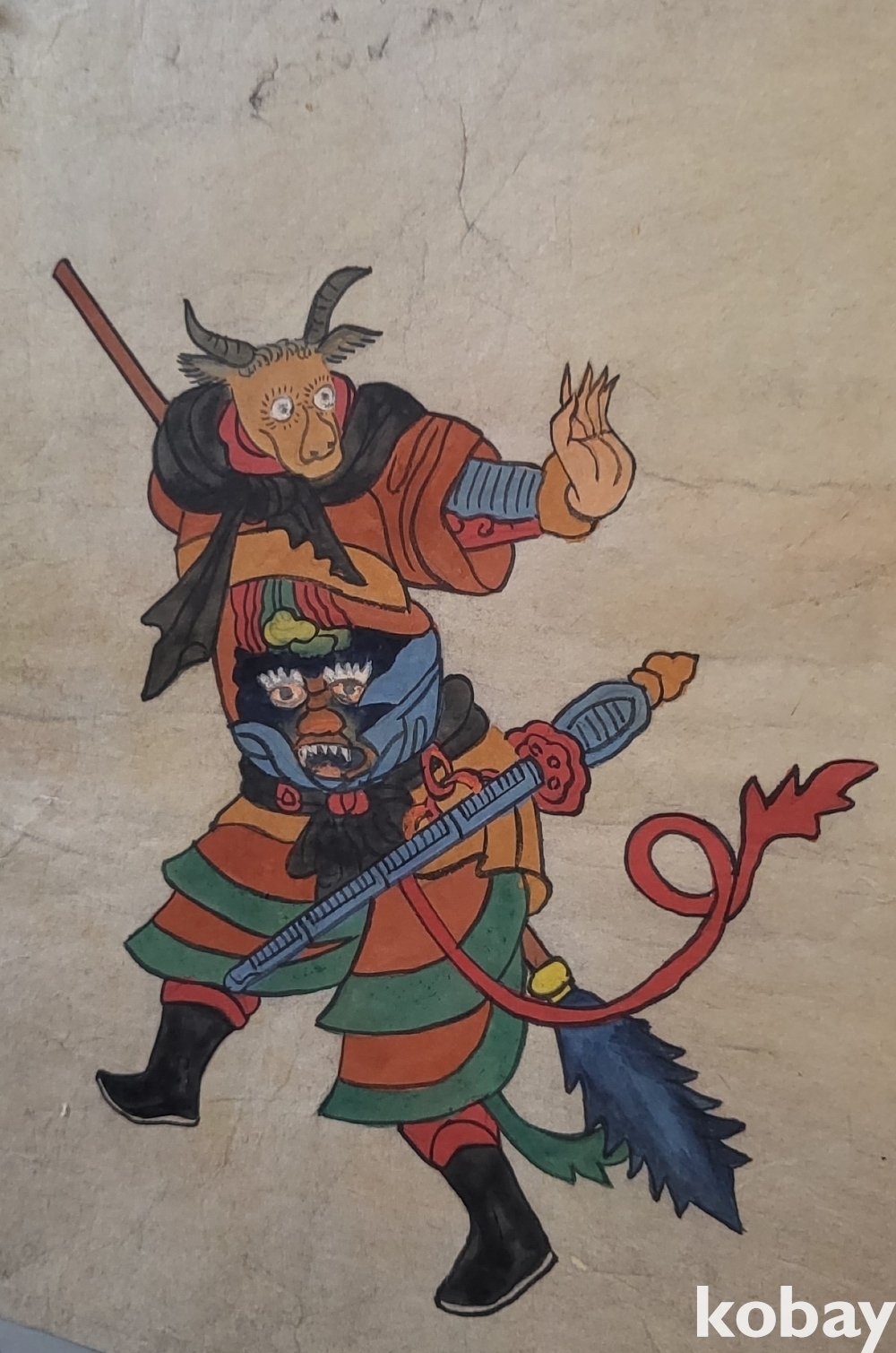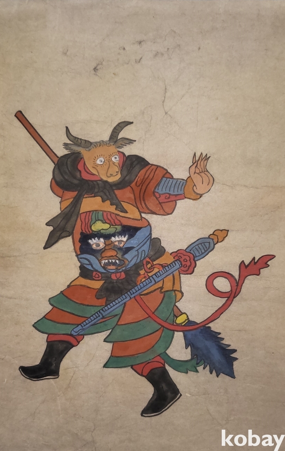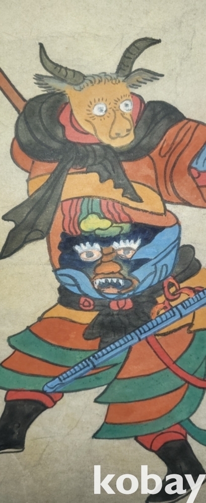 구한말 연대 갖춘 장지 바닥에 당채로 그려진 동물 형상 그림입니다,