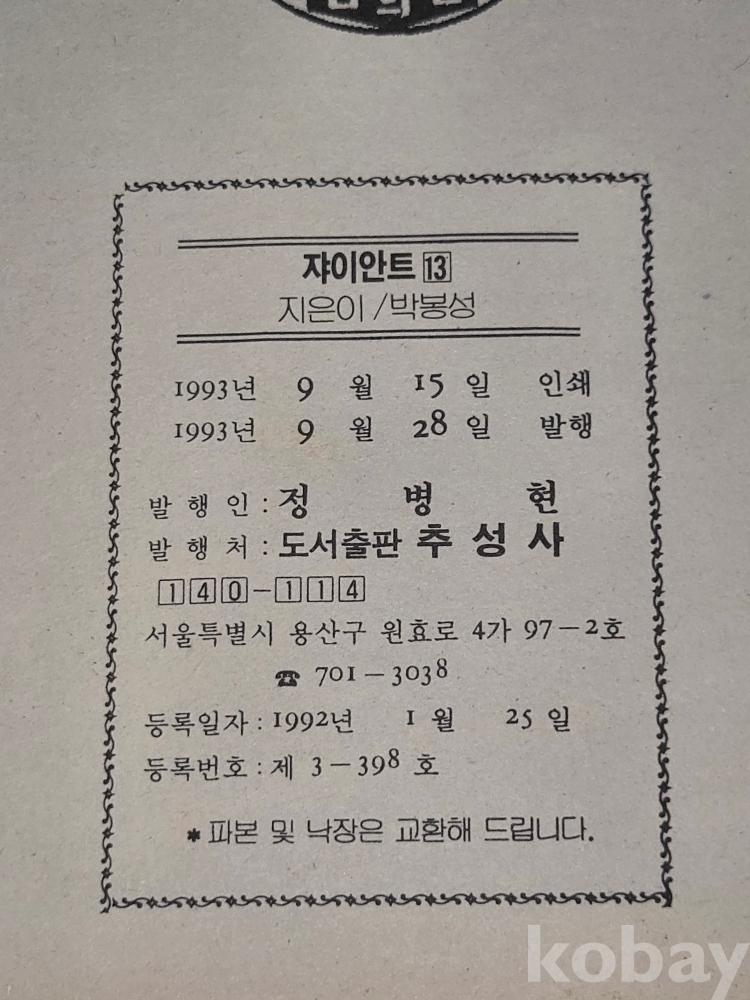 추억의 만화방 ==1993년 발행 / 박봉성 글.그림 = 쟈이언트 13권 완질