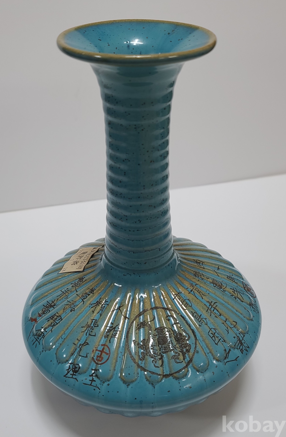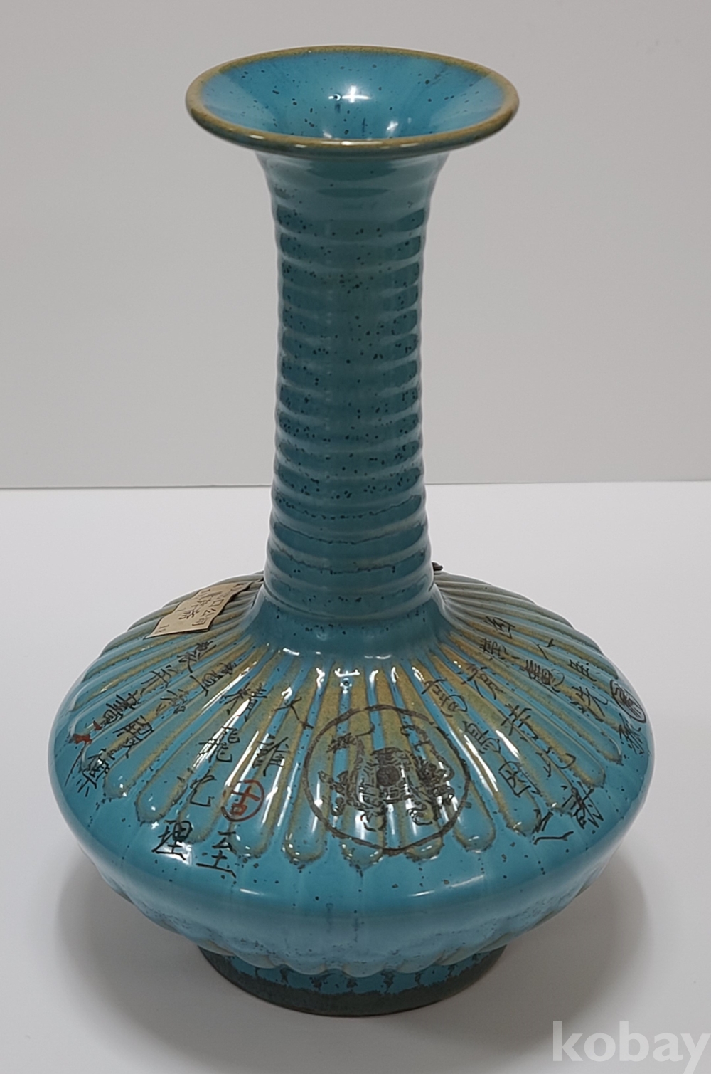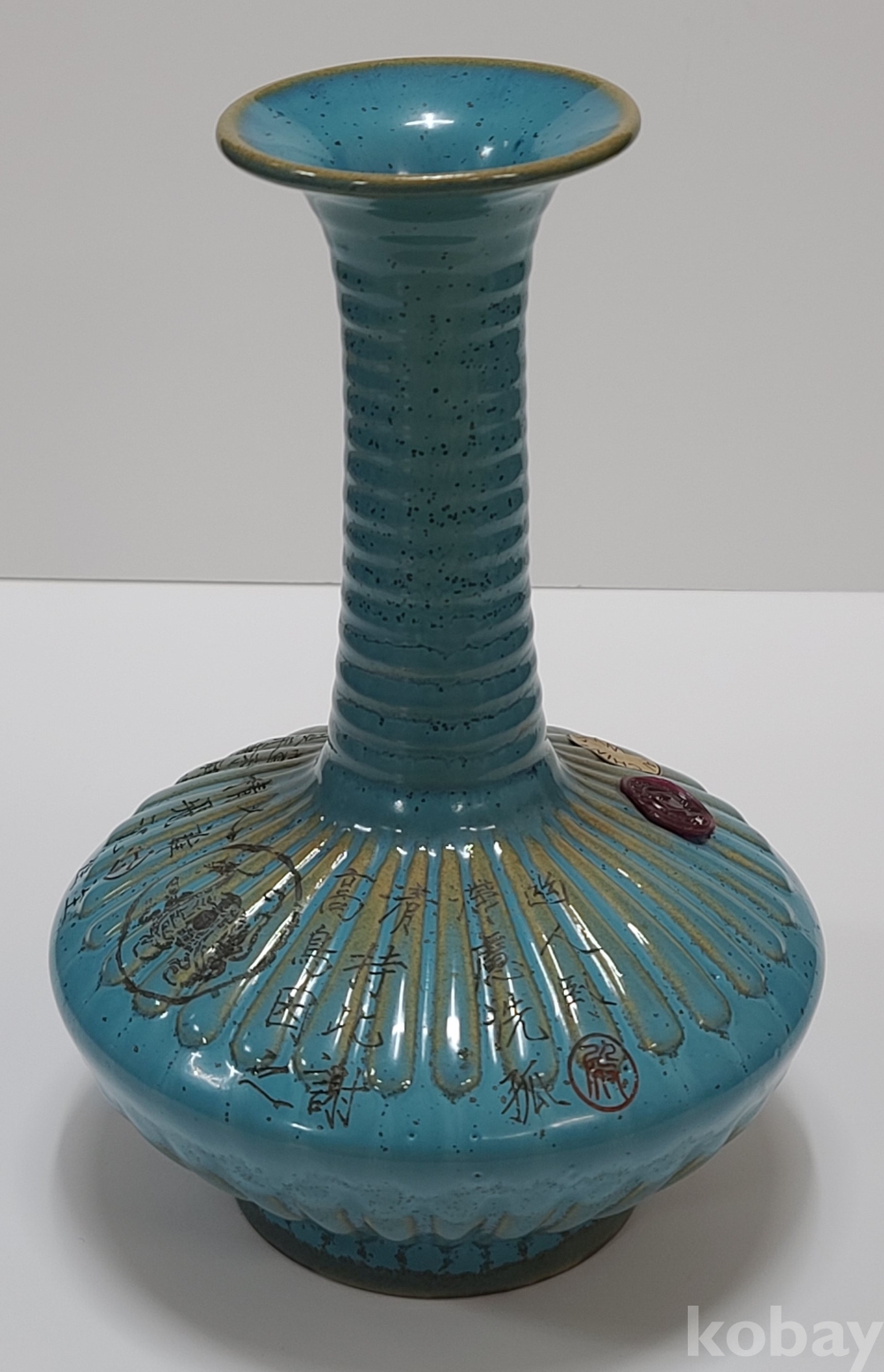 휘종황제의 시문과 그림이(현무) 그려진 기형이 독특한 청천유 여요 화병입니다.