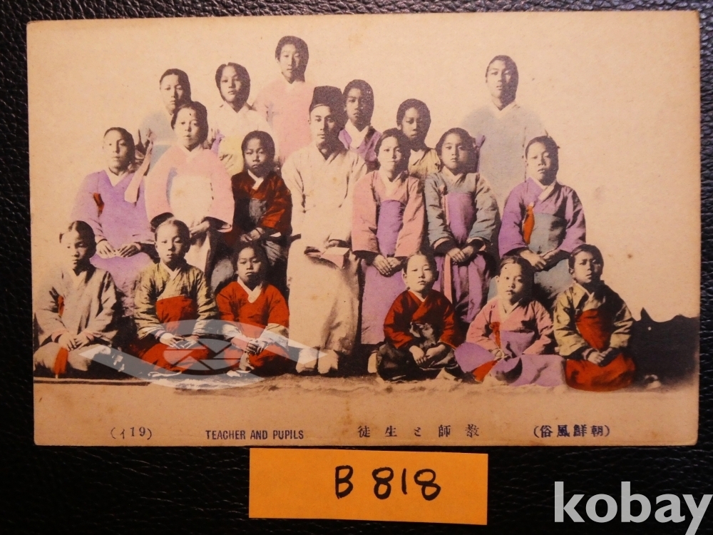 ▣근대한국엽서(진본): 조선의 서당 단체 사진, 서당의 훈장과 아이들 모습, 흑백 엽서에 손으로 색을 칠한 수채색 엽서.