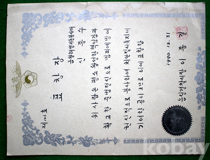 (졸업장 및 상장) 1990년 음성경찰서장의 표창장