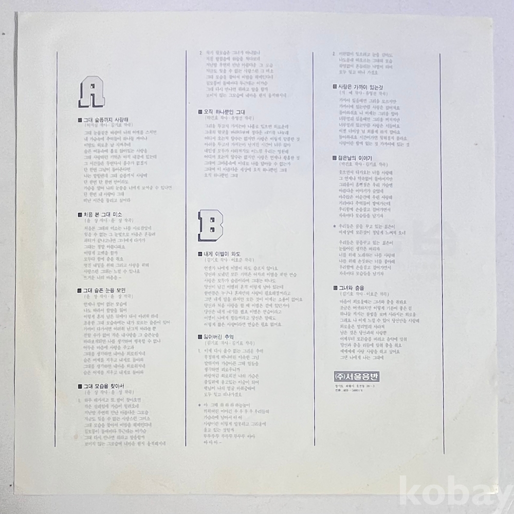 | 자켓상태 | EX : 약간의 마모, 모서리 찢김 존재 | 음반상태 | EX : 재생에 영향 없는 가벼운 기스 존재 | 발매정보 | 알수없음 | 가사지여부 | 유 |