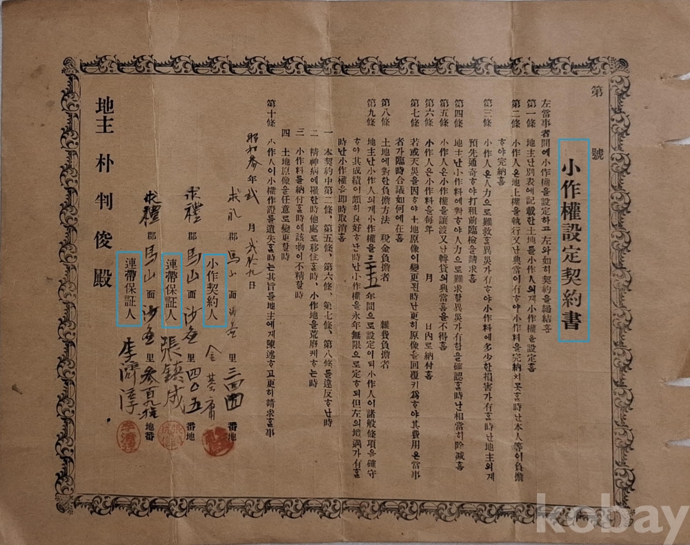 ◈ 소화(昭和) 3년(1928)에 구례 토지면의 소작인(小作人)과 지주(地主) 간에 체결한 소작권설정계약서이다.