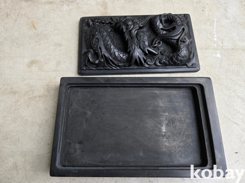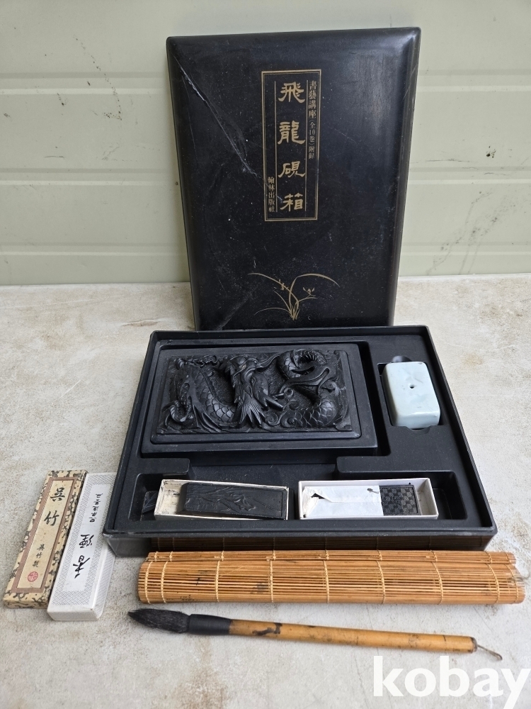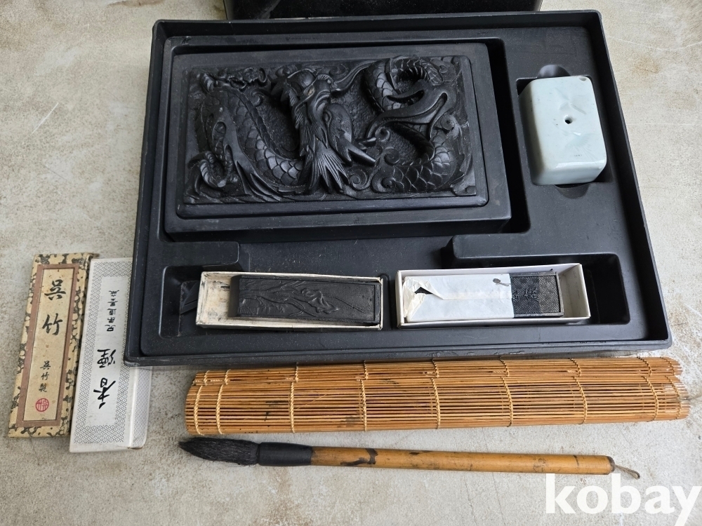 용 벼루, 먹 2개, 연적, 붓, 대나무 발 셋트 입니다.