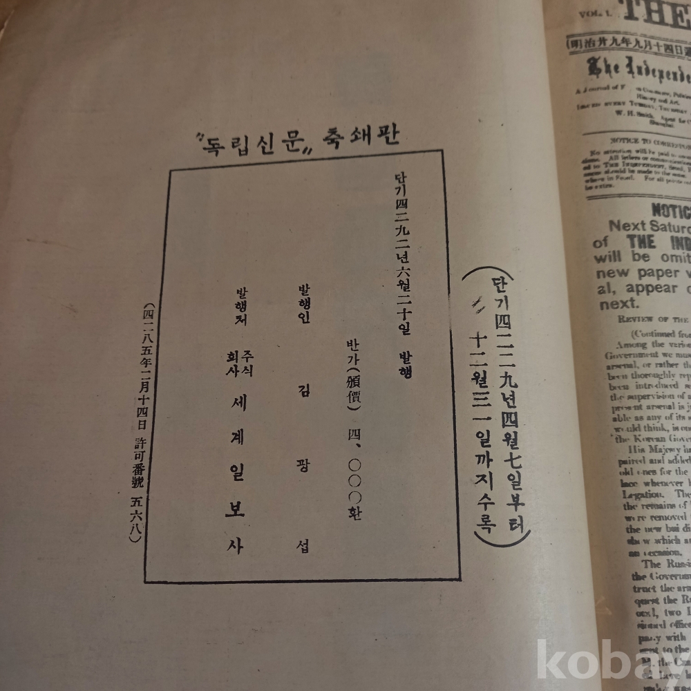 A 4709: 독립신문 축쇄판 1896년 4월 7일 창간호~116호(1959년 발행)