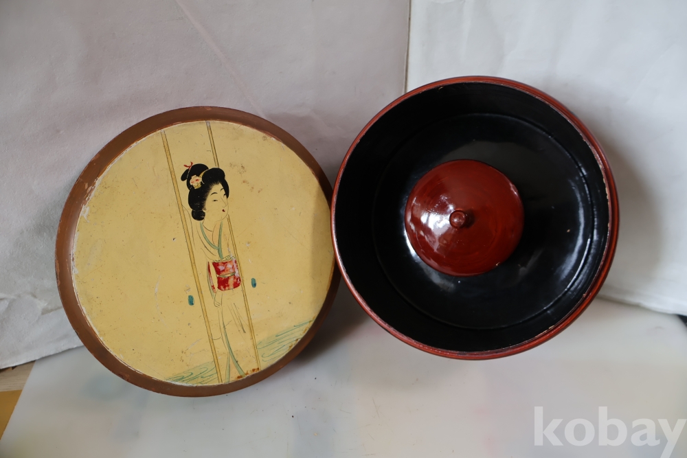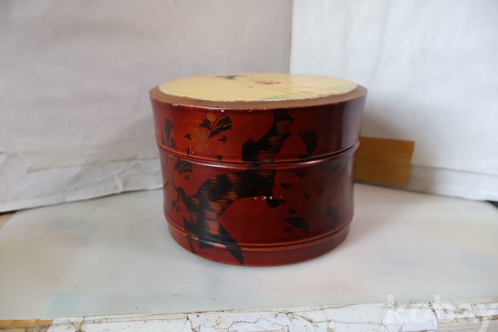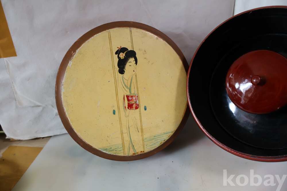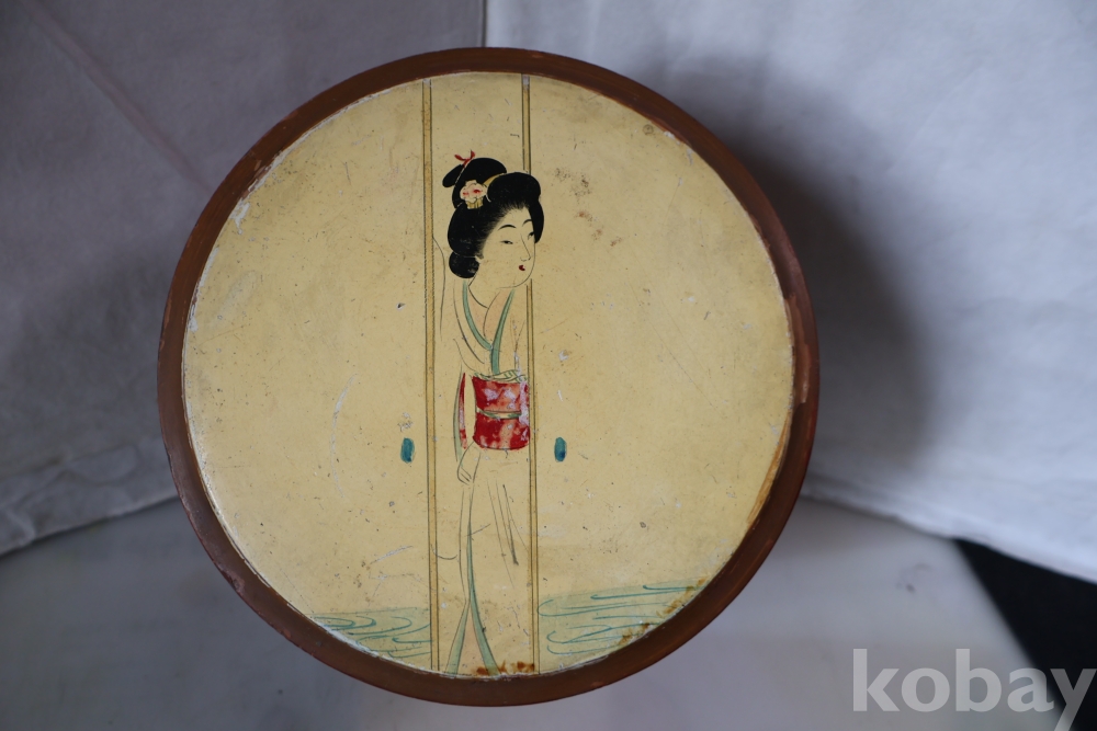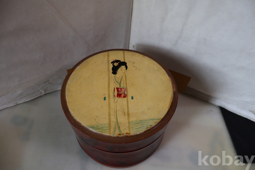 멋진 게이샤 의 모습 안쪽으로 앙증 맞은 상자? 등이 보이는 나무 옷칠 상자 임니다 세월의 흔적이 보임니다 .극히 귀한 공예품 임니다 사진 참조 하세요