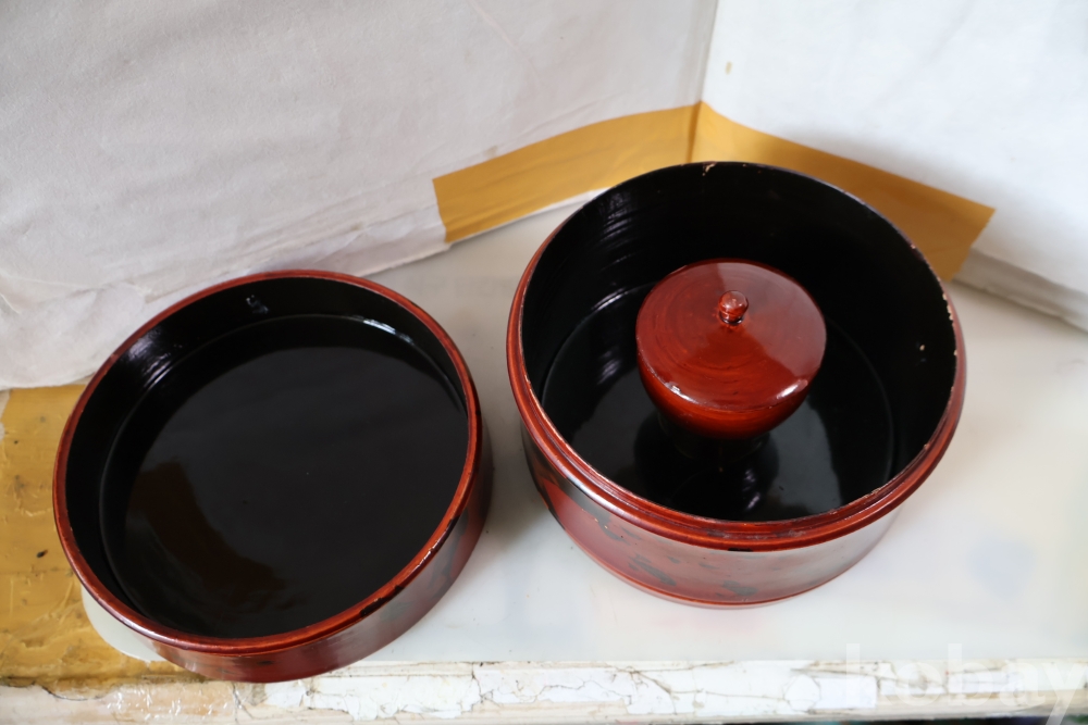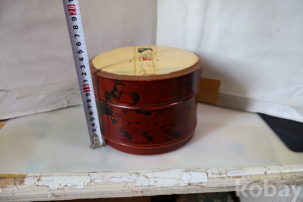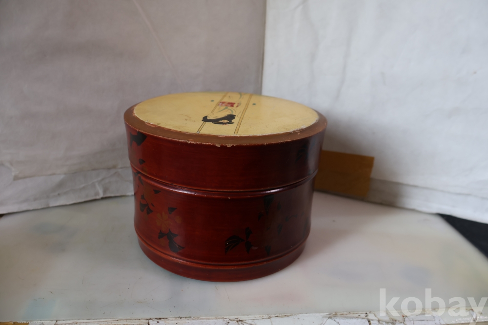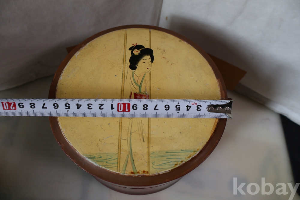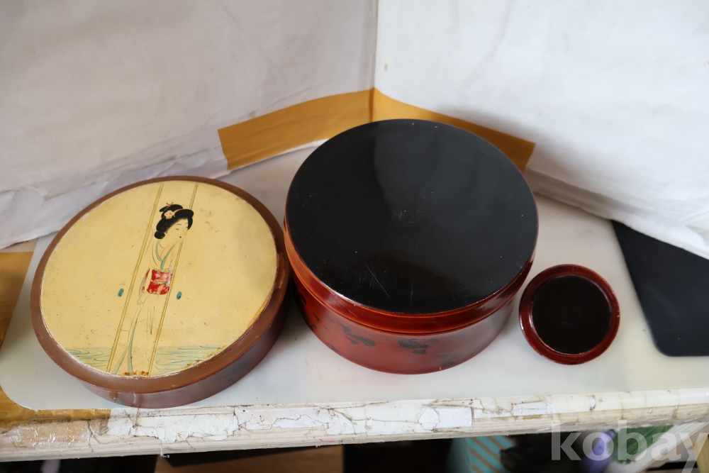 멋진 게이샤 의 모습 안쪽으로 앙증 맞은 상자? 등이 보이는 나무 옷칠 상자 임니다 세월의 흔적이 보임니다 .극히 귀한 공예품 임니다 사진 참조 하세요