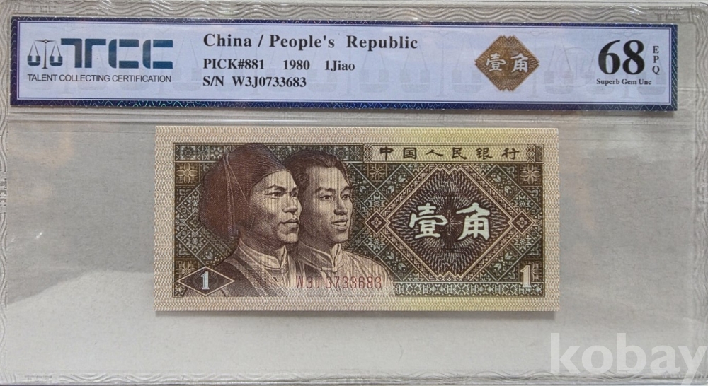 -1980년 중국 인민은행 발행 1각 지폐 TCC68 고등급 입니다.