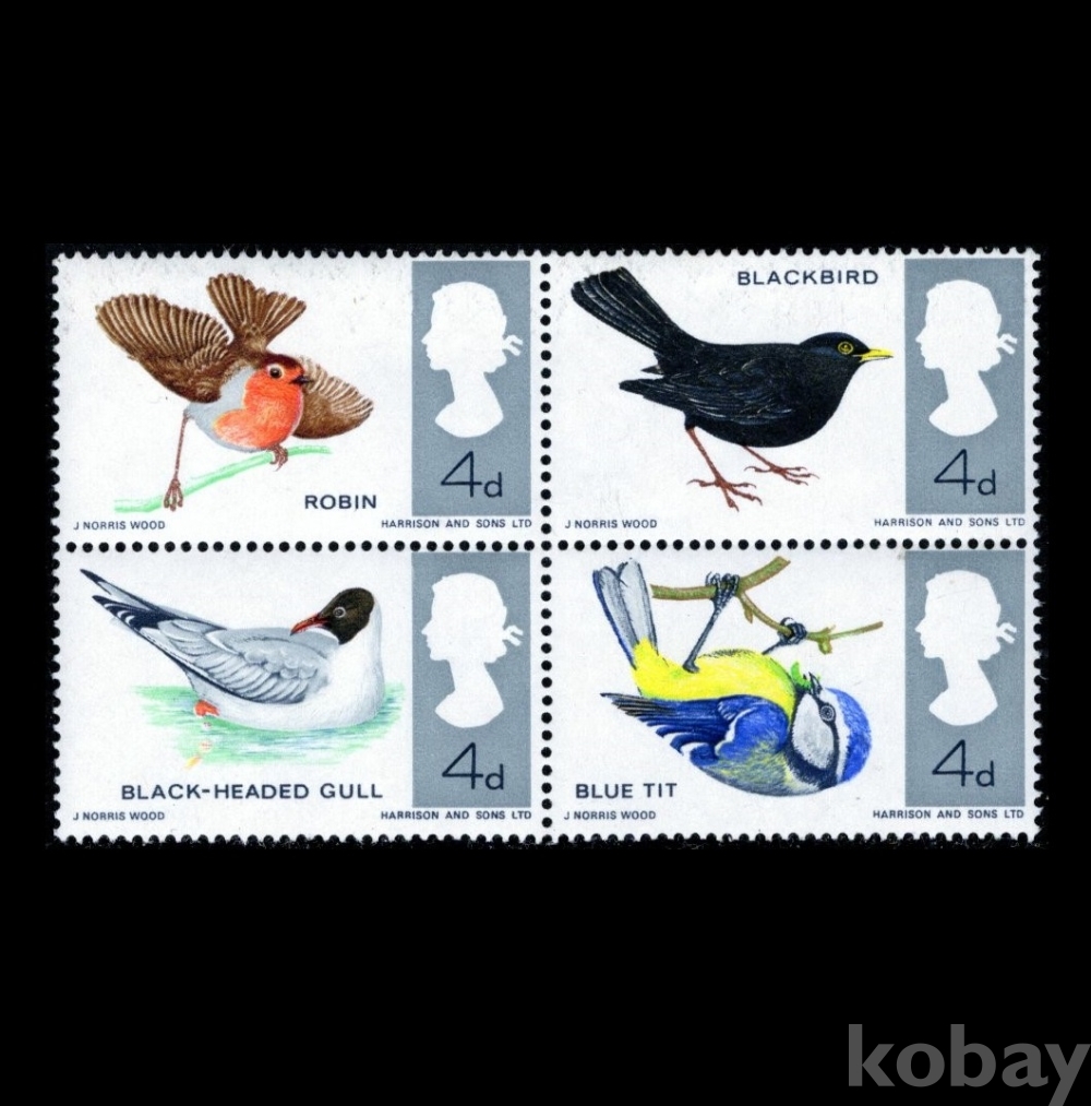 영국) 1966년 조류(검은머리 갈매기,파랑새,유럽 울새,유럽 검은새) MNH OG