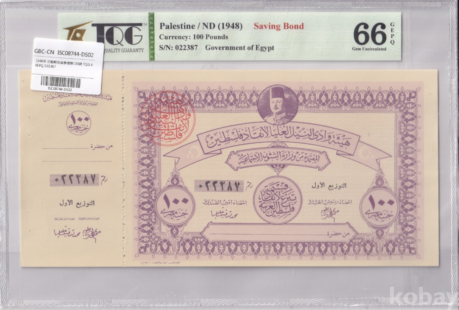 - 이 채권은 1948년 제1차 중동 전쟁(아랍-이스라엘 전쟁) 당시 팔레스타인을 지원하기 위해 이집트 정부에서 발행한 것입니다.