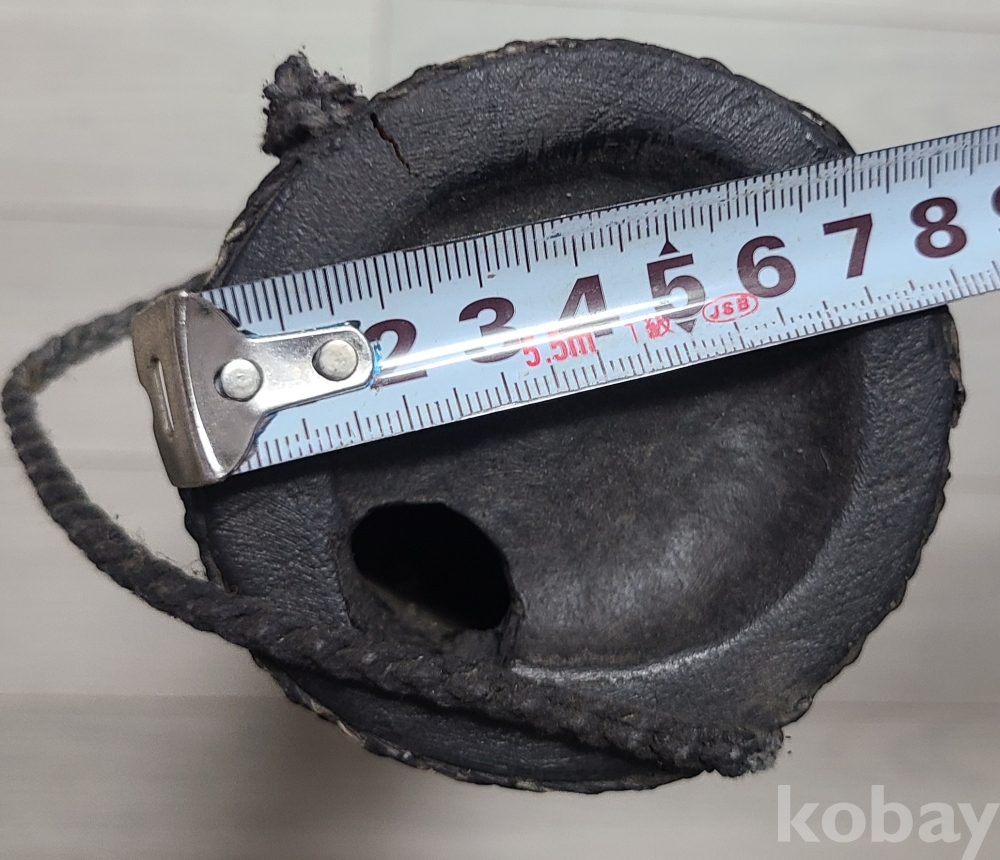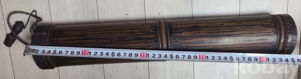 대나무의 마디와 결이 그대로 살아있으며, 양 끝단과 중앙에 띠를 둘러 견고함을 더했습니다. 한쪽 끝에는 끈이 달려 있어 휴대하거나 걸어두기에 용이합니다.