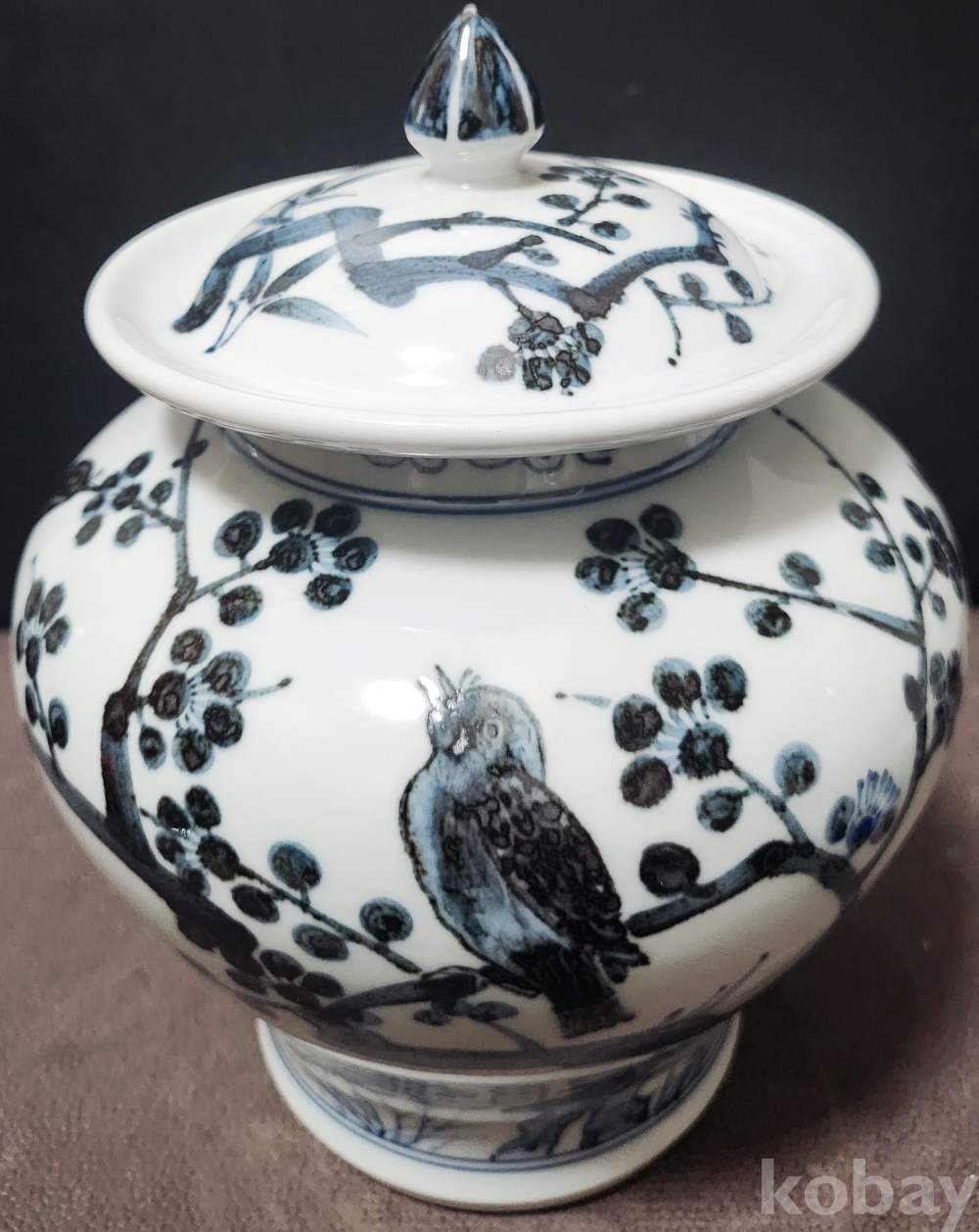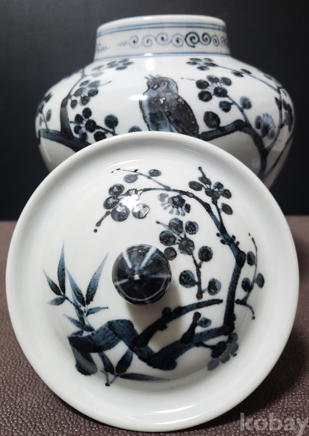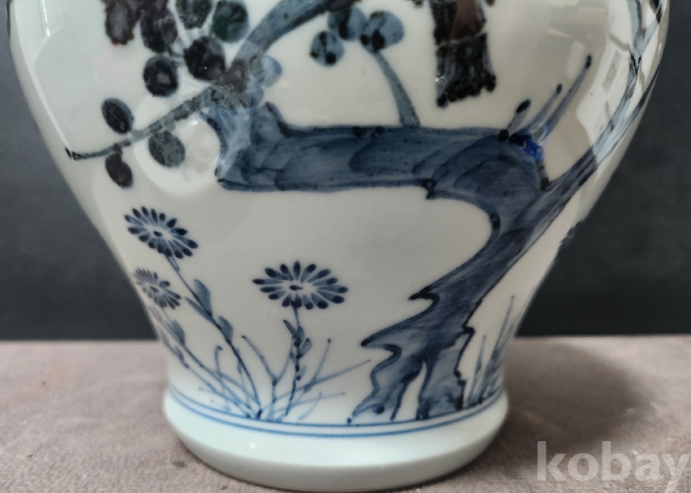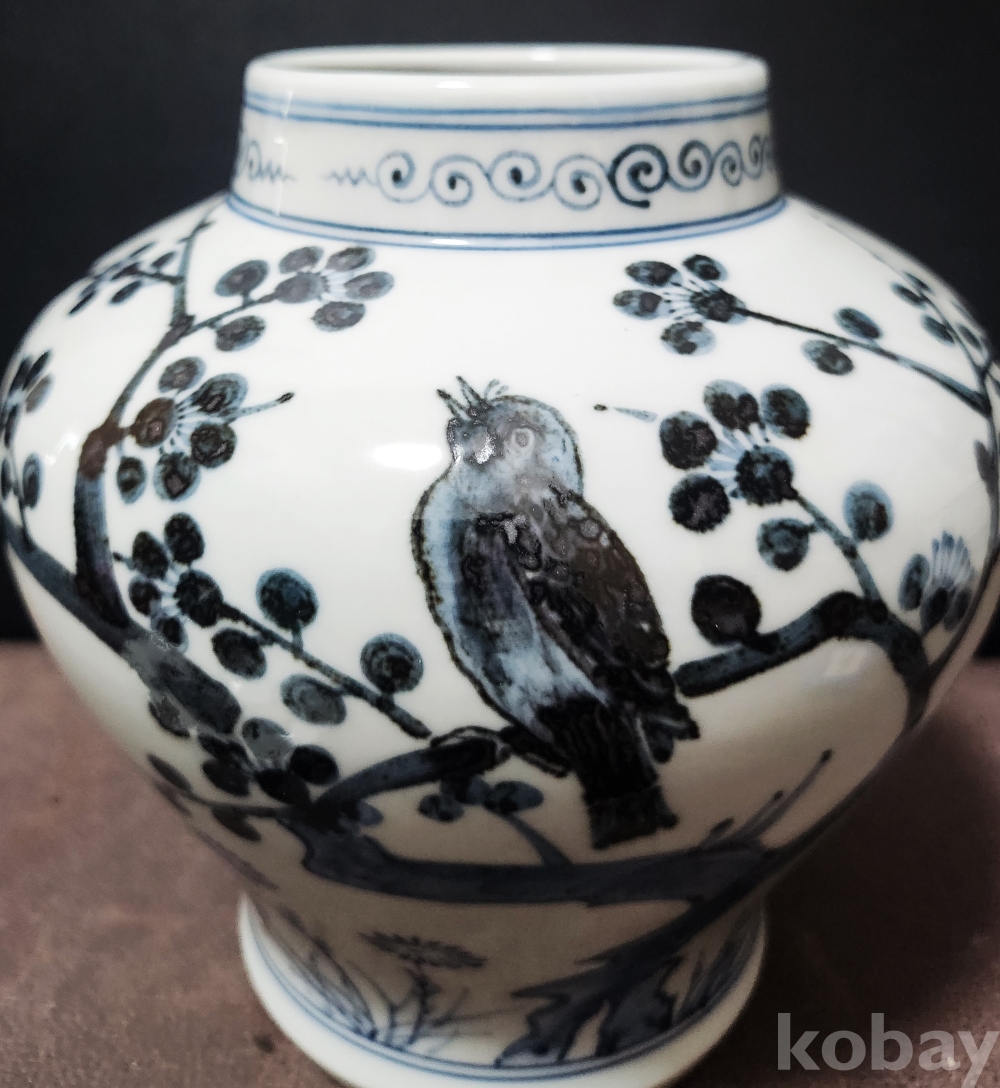 백자청화진사죽매조도문유개호 白磁靑華辰沙竹梅鳥圖紋有蓋壺