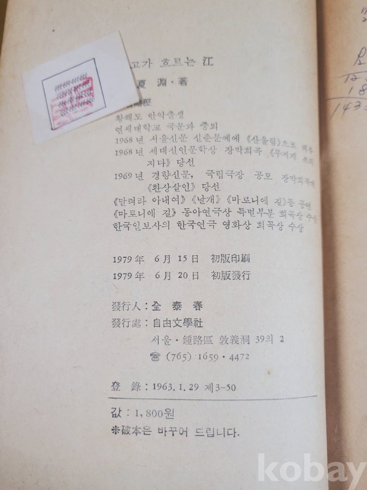 1. 탱고가 흐르는 강, 정하연, 자유문학사, 1979년, 390쪽, 상태 중(뒤표지 없음), 사진 참조