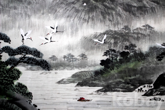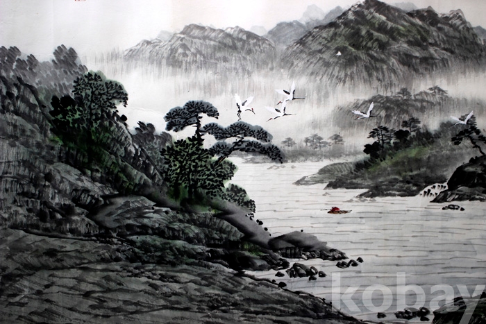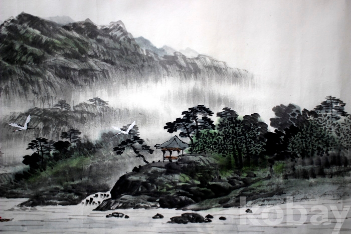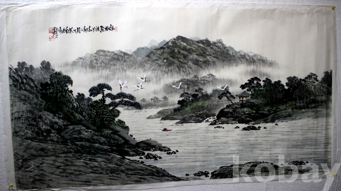 대전 입선작가인 雲齋(운재) 강태수의 대형작품 - 정자가 있고 학이 날으는 강가의 여름풍경