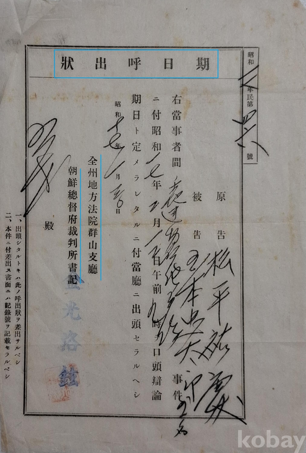 ◈ 원고와 피고에게 구두(口頭)로 변론할 기일이 정해졌으니 군산지청에 출두하라는 문서.