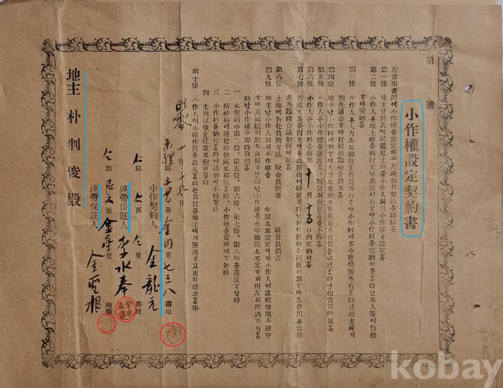 구례 토지면의 소작인(小作人)과 지주(地主) 간에 체결한