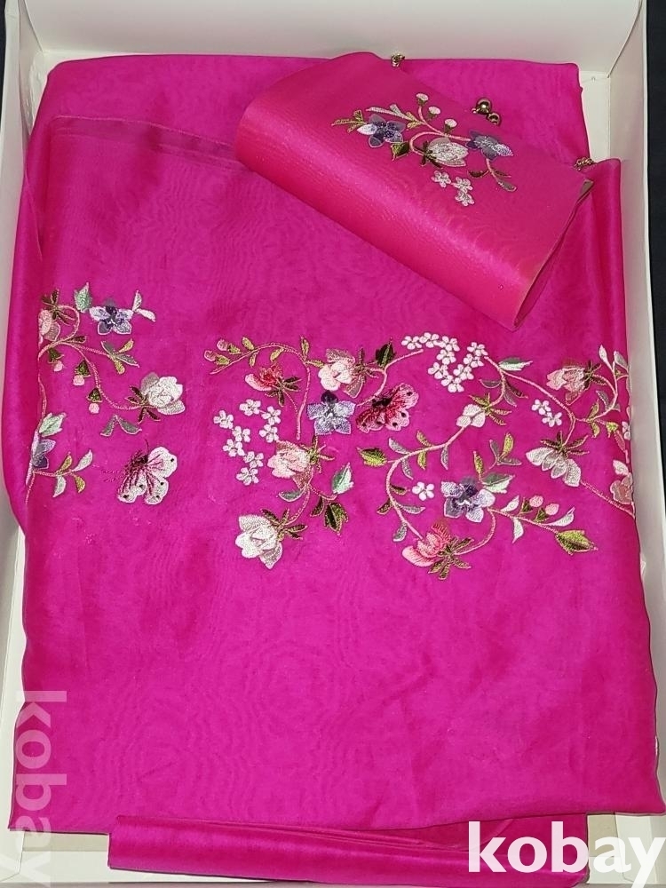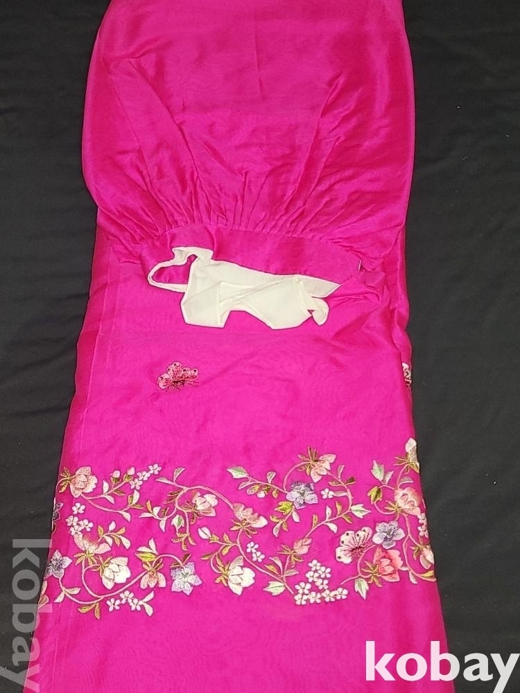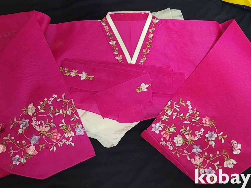 아름다운 꽃 자수가 있는 분홍색 고급 한복입니다.