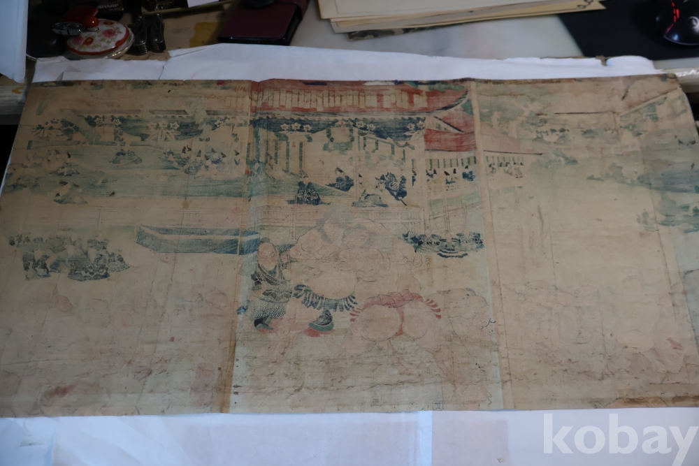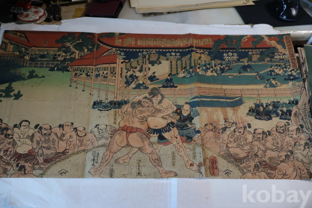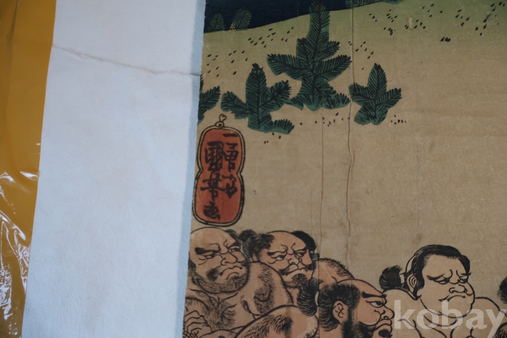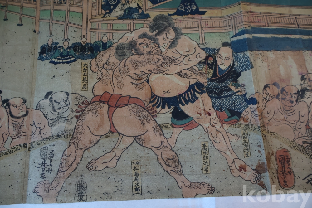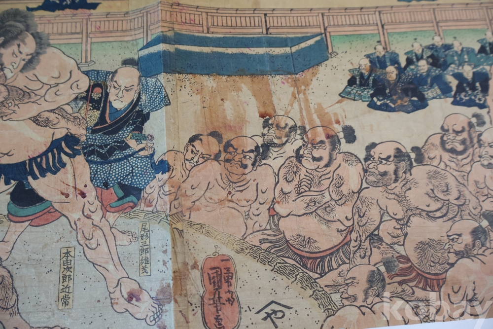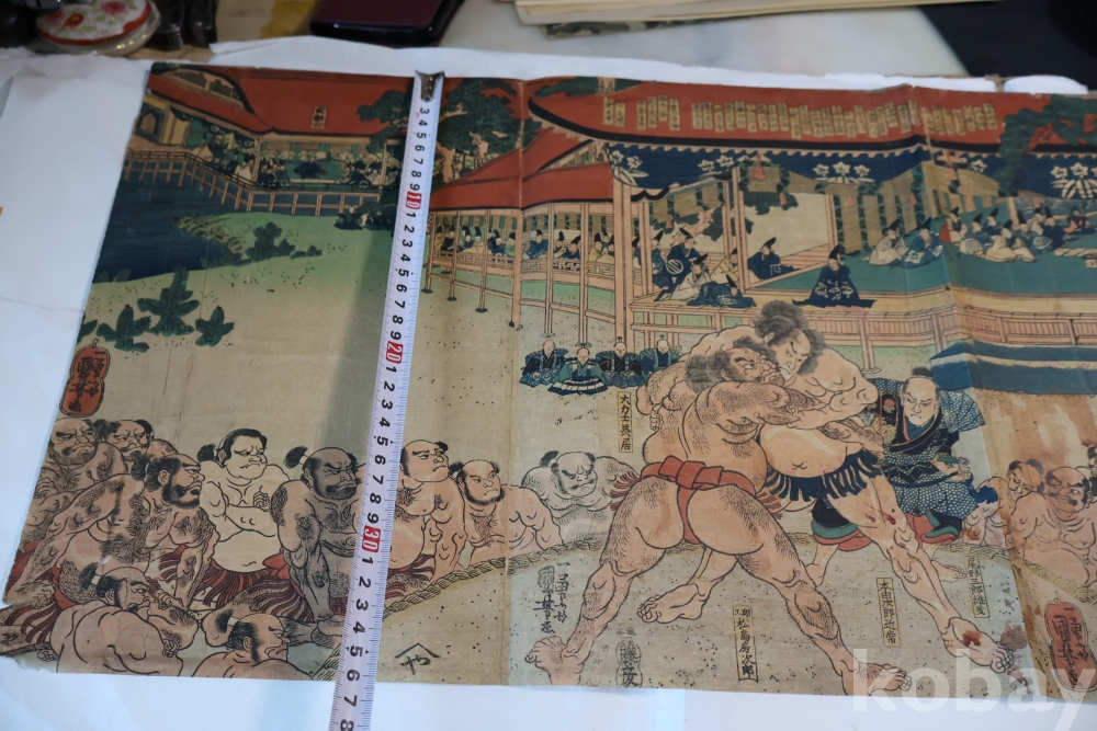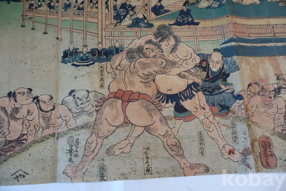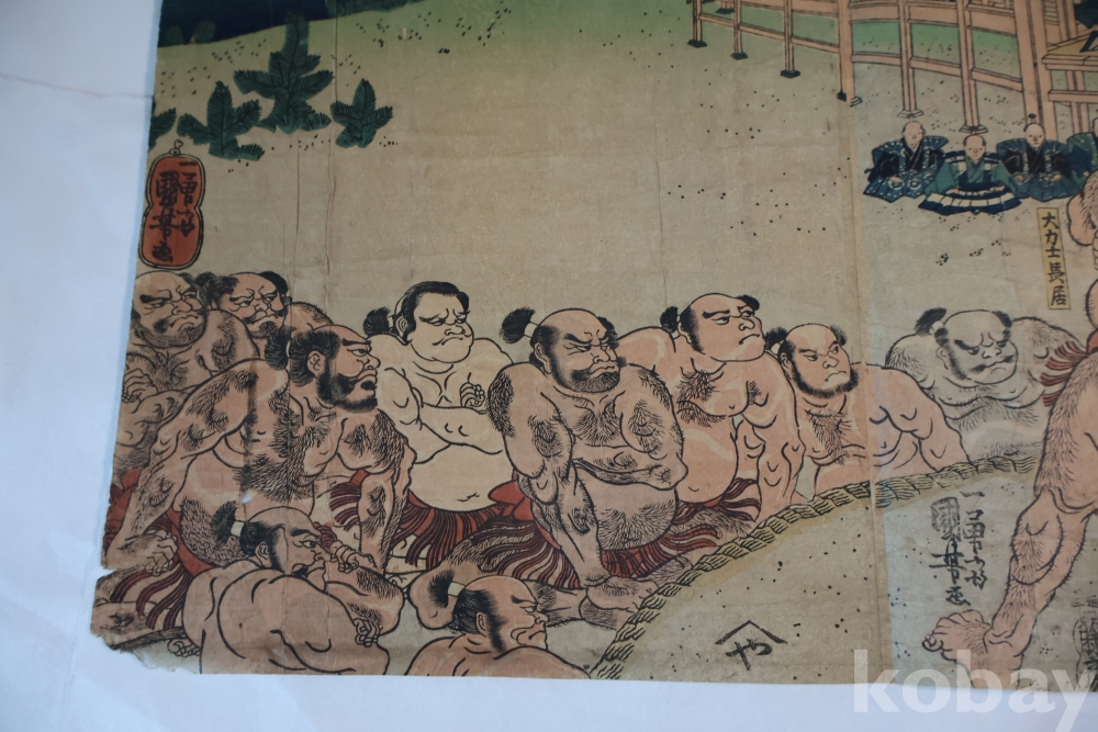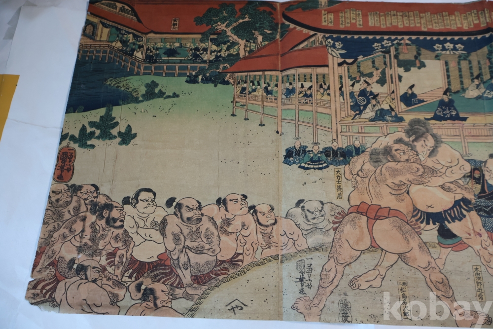 우키오에 목판화 원본 구니요시 임니다 스모 선수를 가진 귀한 명품 임니다 KUNIYOSHI UTAGAWA (1798-1861) 귀한 소제의 명화 임니다 세월의 흔적이 보이는 극히 귀한 명화