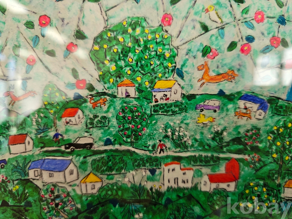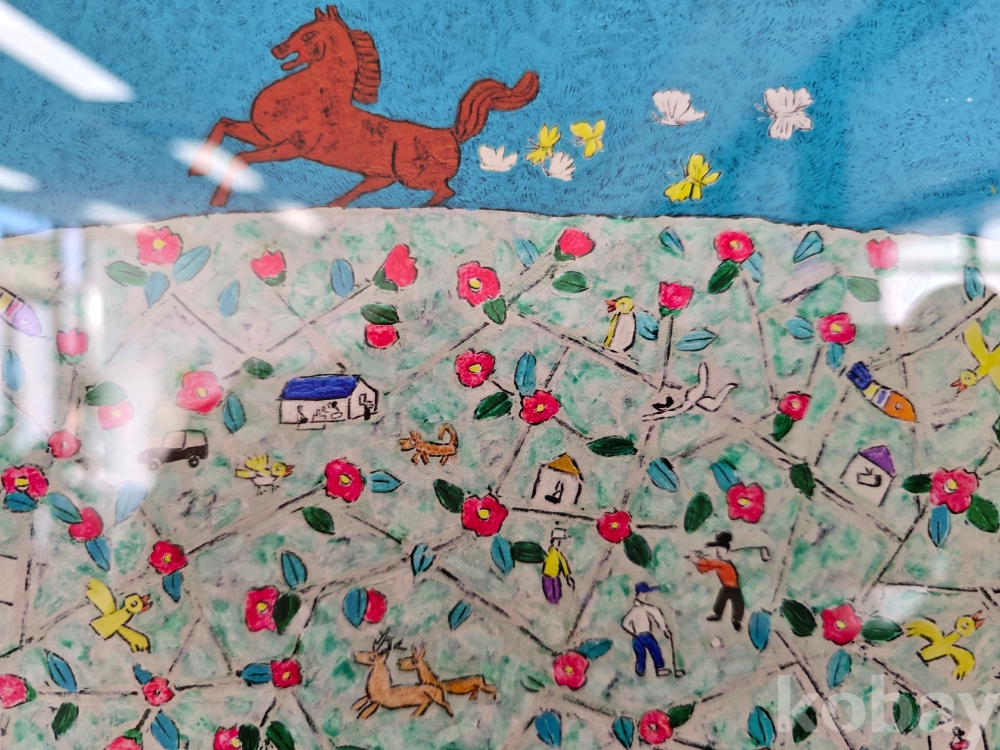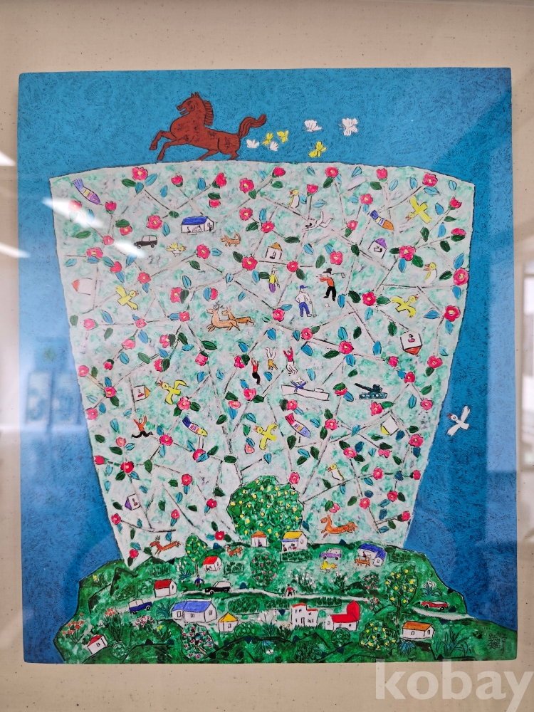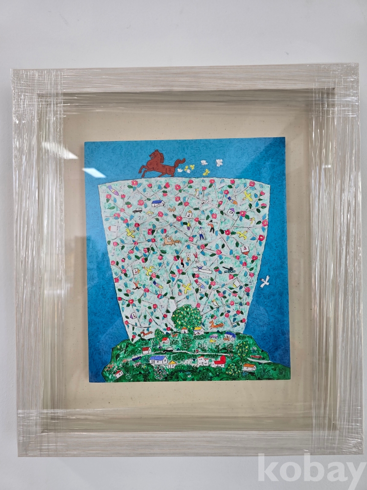 작품 설명: 푸른 배경 위에 말과 새가 배치돼 있고, 중앙에는 꽃과 인물, 사물 요소가 반복적으로 구성된 넓은 면이 자리하고 있다. 하단에는 녹지와 주택이 모여 있는 마을 풍경이 표현돼 있으며, 선명한 색채 대비와 장식적 구성 방식이 화면 전반에 나타난다.
