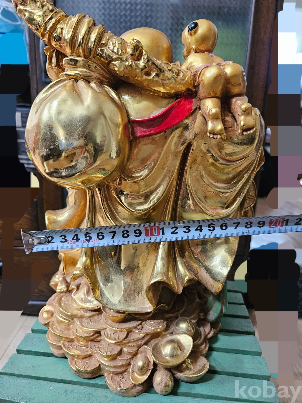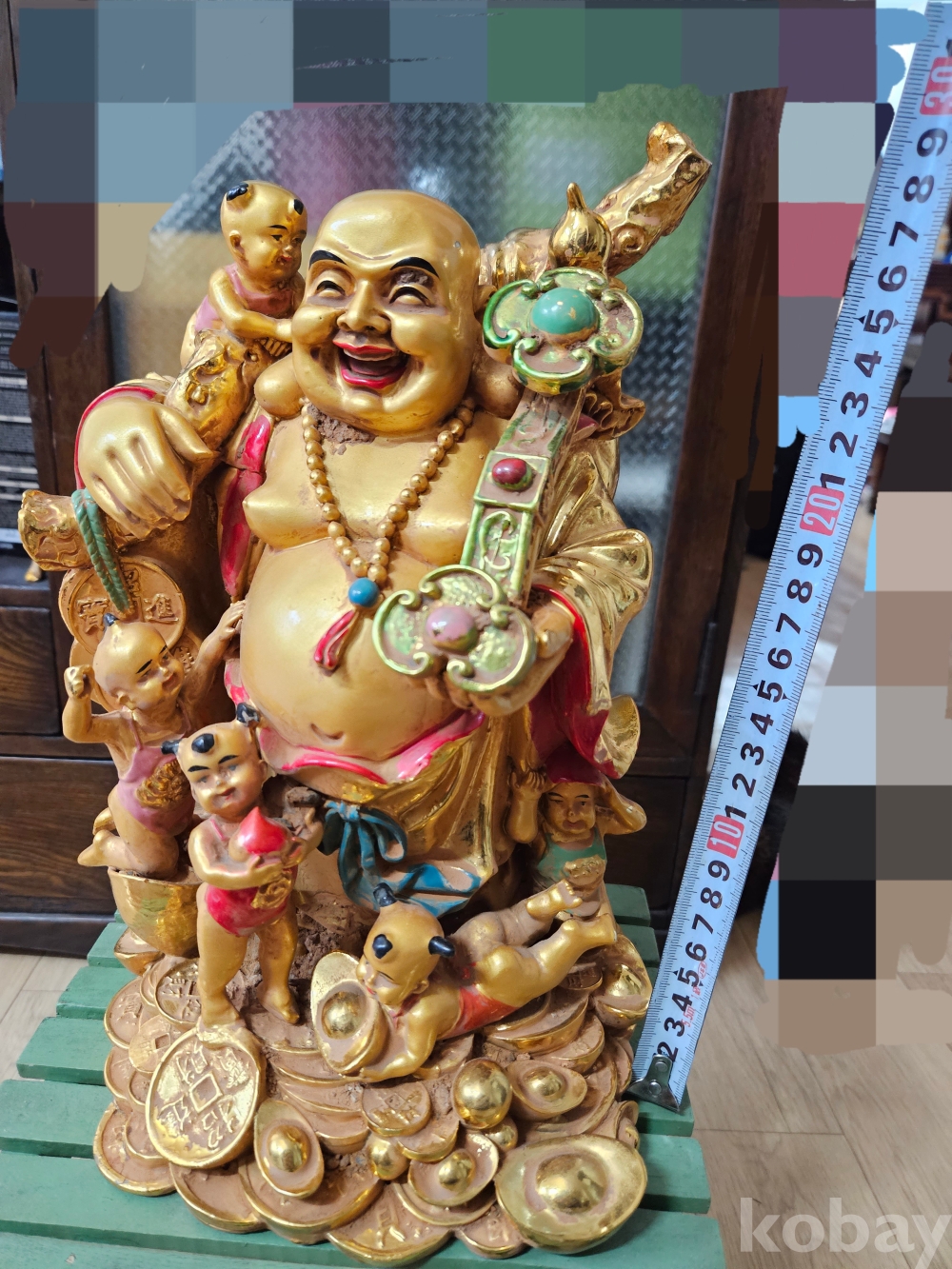 이 조각상은 풍만하고 즐겁게 웃는 모습이 특징인 포대화상(布袋和尙, Hotei 또는 Budai)을 묘사하고 있습니다.