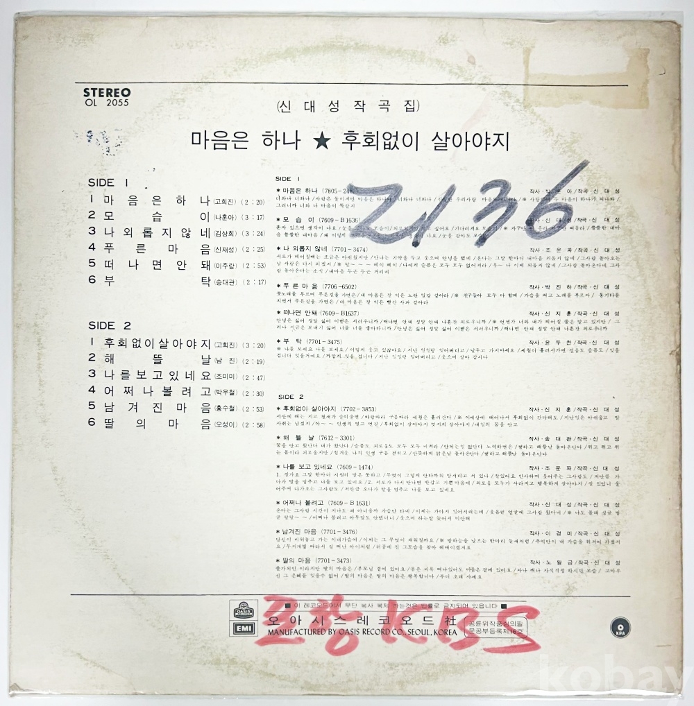 상품 설명 | Side A 1. 마음은 하나 (고희진) 2. 모습이 (나훈아) 3. 나 외롭지 않네 (김상희) 4. 푸른마음 (신재성) 5. 떠나면 안돼 (이주랑) 6. 부탁 (송대관) Side B 1. 후회 없이 살아야지 (고희진) 2. 해뜰날 (남진) 3. 나를 보고 있네요 (조미미) 4. 어쩌나볼려고 (박우철) 5. 남겨진 마음 (홍수철) 6. 딸의 마음 (오성이) | ||