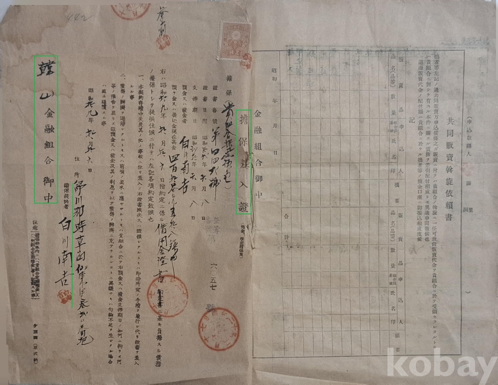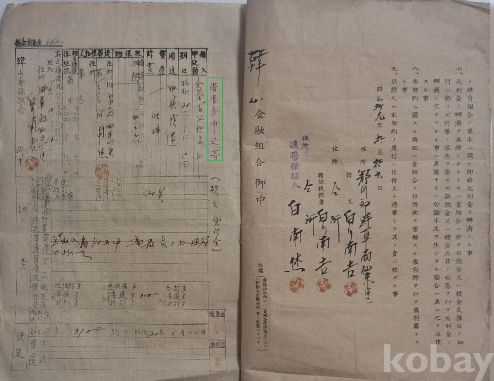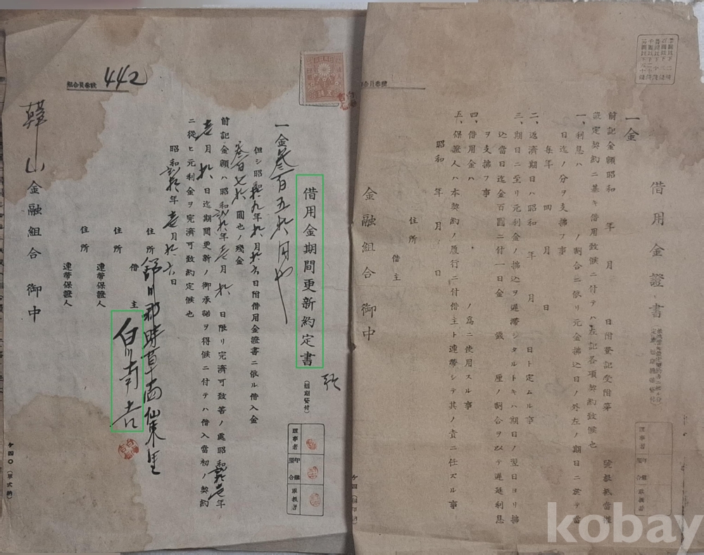 ◈ 백천남길(白川南吉 : 白南吉)과 한산금융조합(韓山金融組合) 간에 체결한 문서 5건.