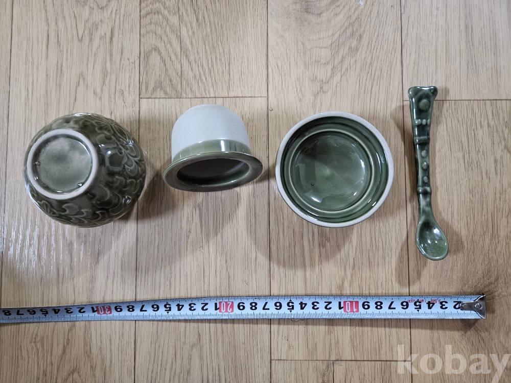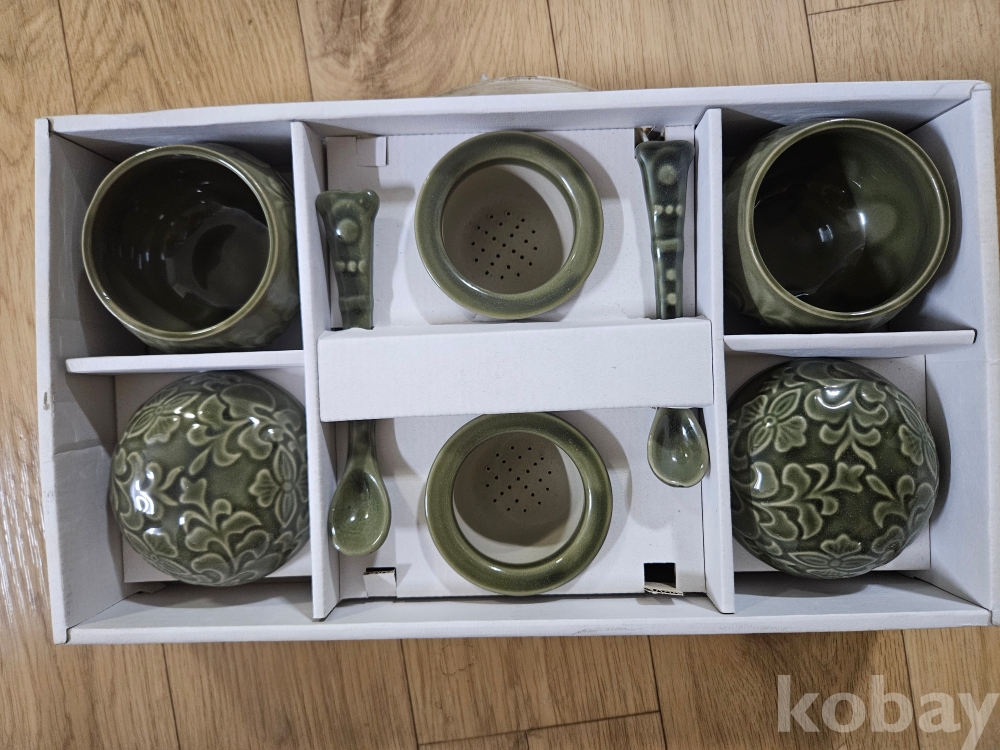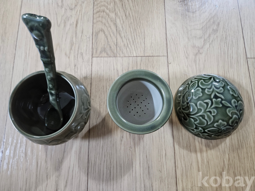 비색 청자 양각 당초문 다구 세트 (찻잔/거름망/스푼 2인 구성)