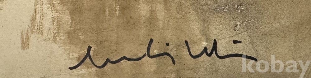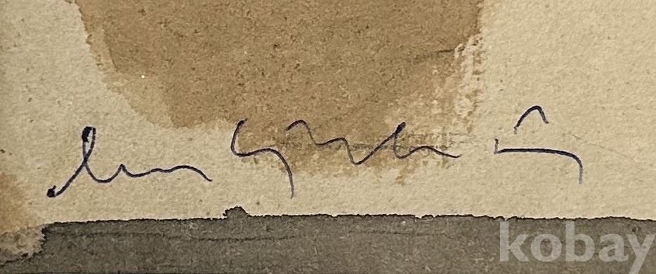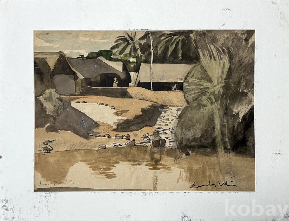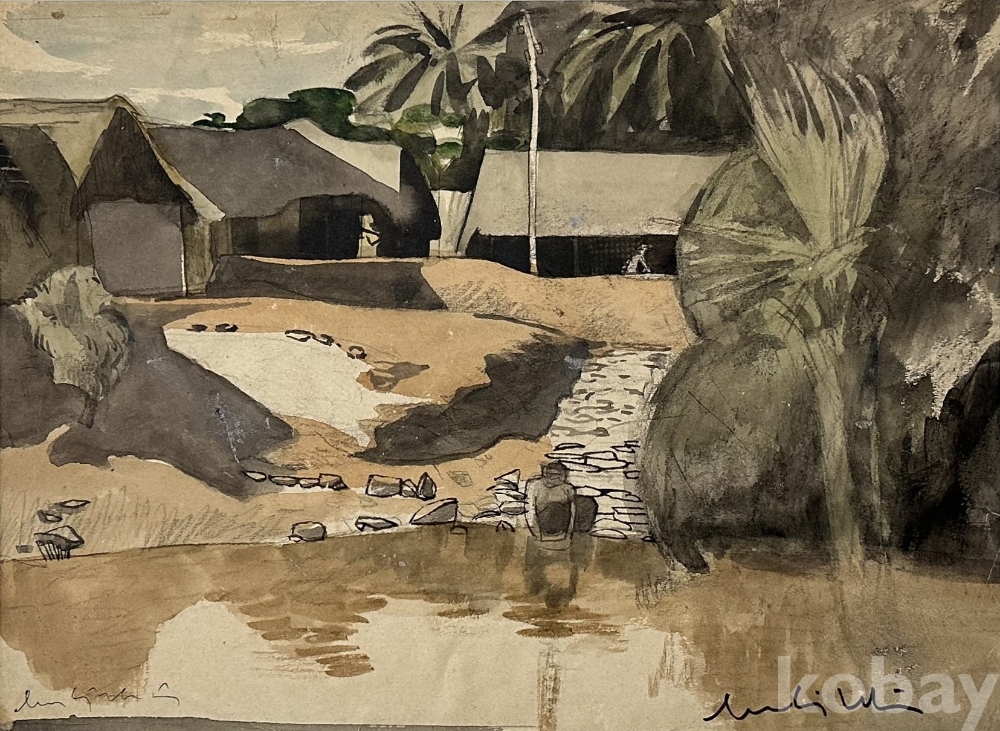강가를 배경으로 초가 형태의 건물과 야자수, 인물의 실루엣이 어우러진 풍경화입니다. 화면 전반에 갈색, 회색, 흑색 위주의 절제된 색감이 사용되어 고요하고 이국적인 분위기를 전달하며, 수면의 반사 표현과 간결한 필선이 인상적입니다. 전체적으로 빈티지한 감상이 돋보이는 소품 크기의 회화 작품입니다. 실제 보관 상태에 따른 종이의 생활감, 가장자리 상태, 미세 오염 및 경년감 여부는 사진 참고하시기 바랍니다.