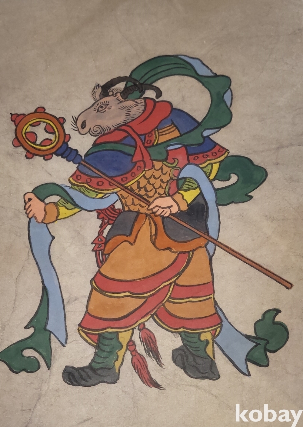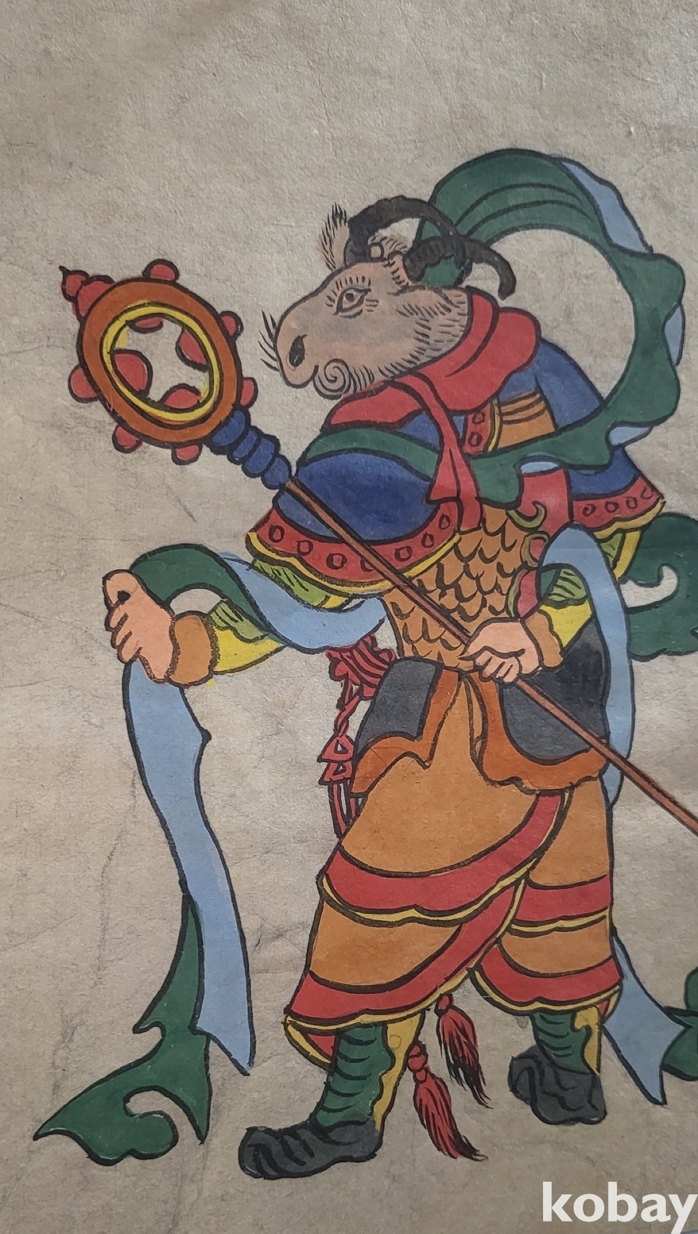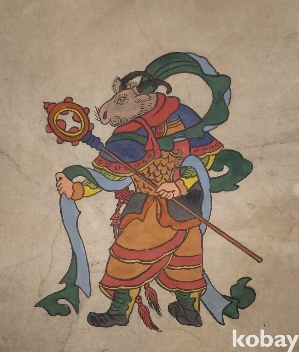 구한말 연대 갖춘 장지 바닥에 당채로 그려진 동물 형상 그림입니다,