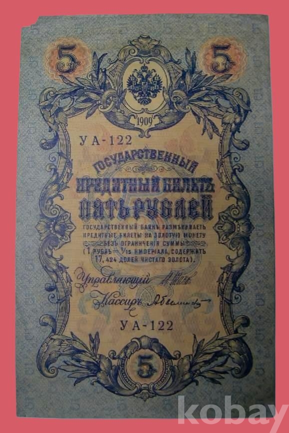 러시아 5 루블 1909년 황금권 黃金券 지폐 (사용제)