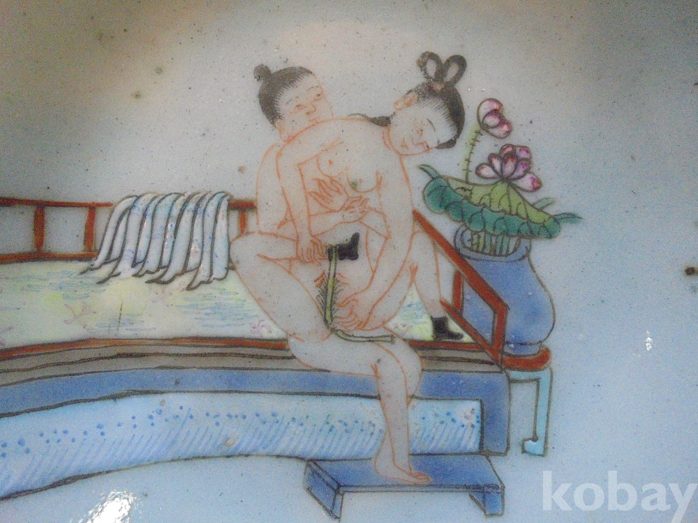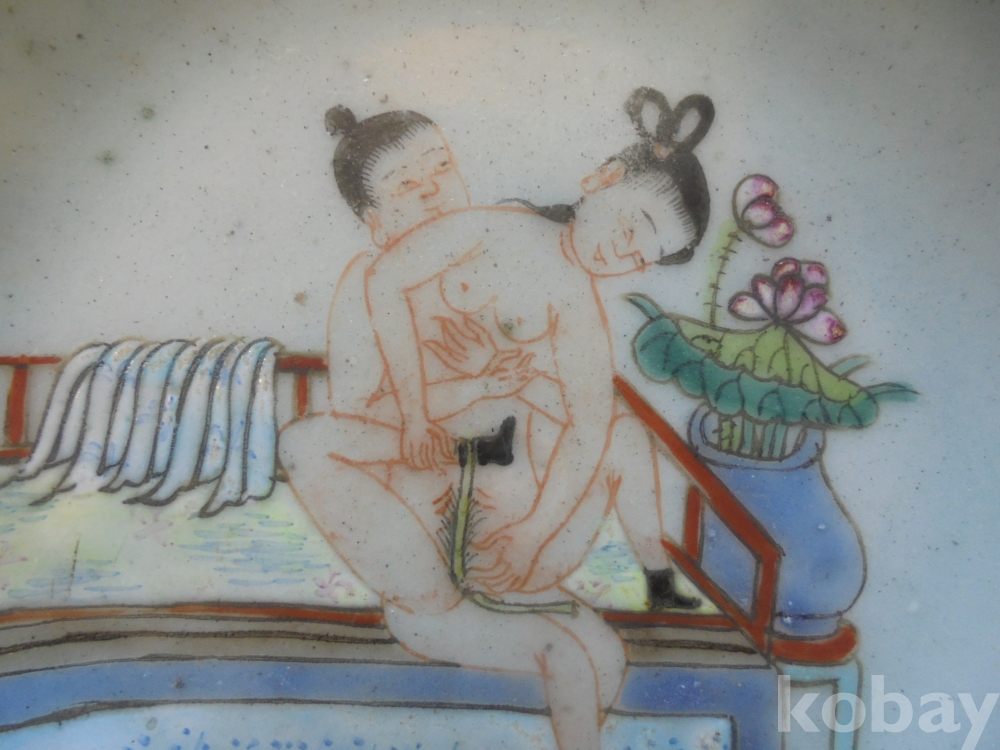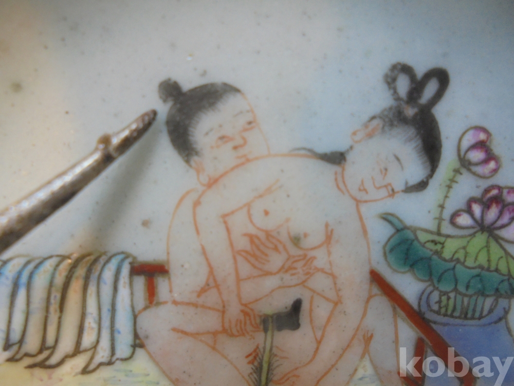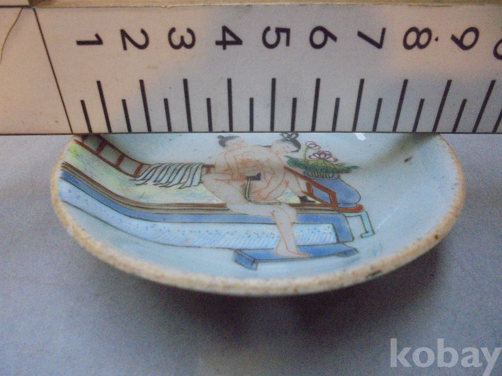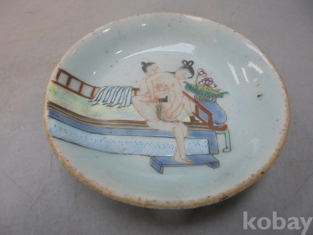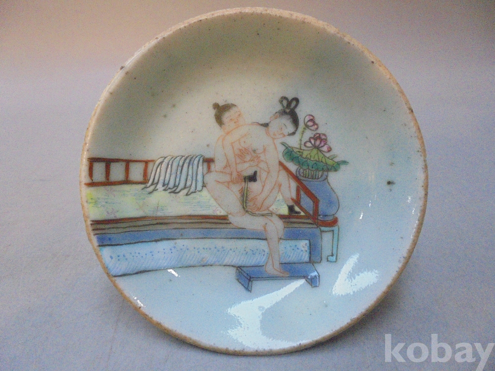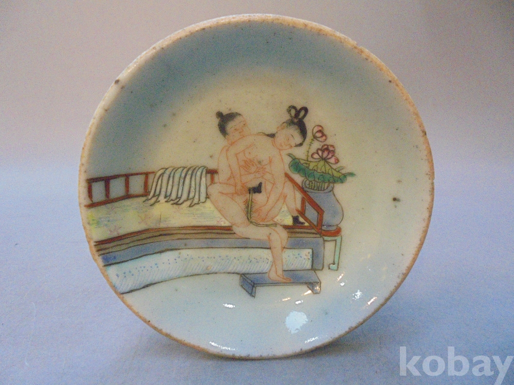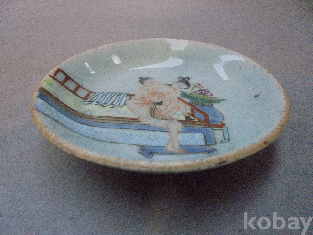 조선말기 " 상투 머리 " 를한 남성과 청나라 기녀가 사랑에 빠져 통정을 하는 극희귀한 문양의 청나라 말기 춘화도 진품 접시 입니다.