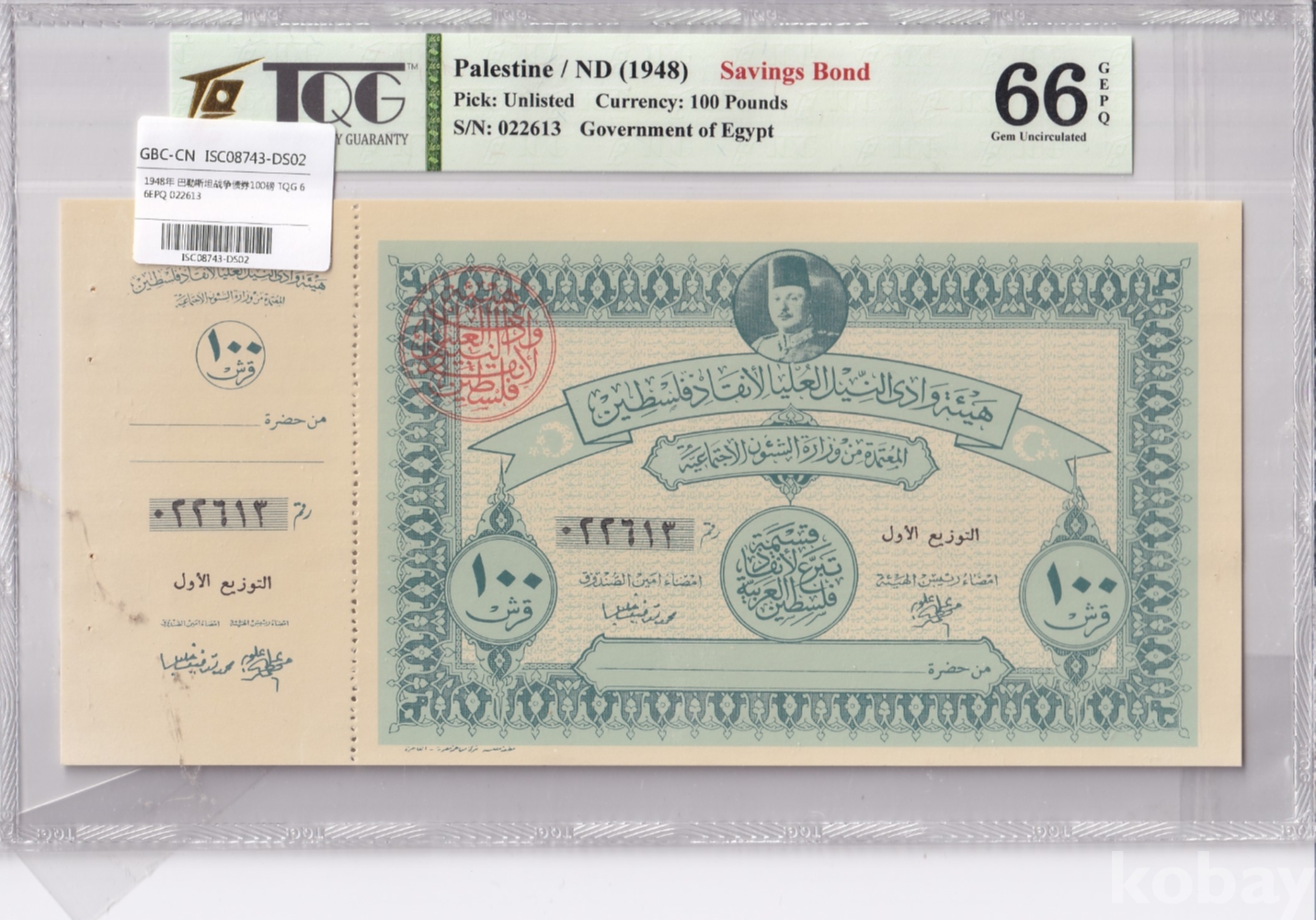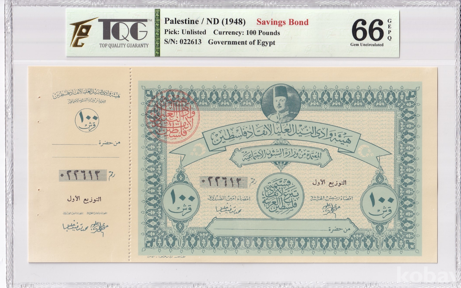 -  이 채권은 1948년 제1차 중동 전쟁(아랍-이스라엘 전쟁) 당시 팔레스타인을 지원하기 위해 이집트 정부에서 발행한 것입니다.
