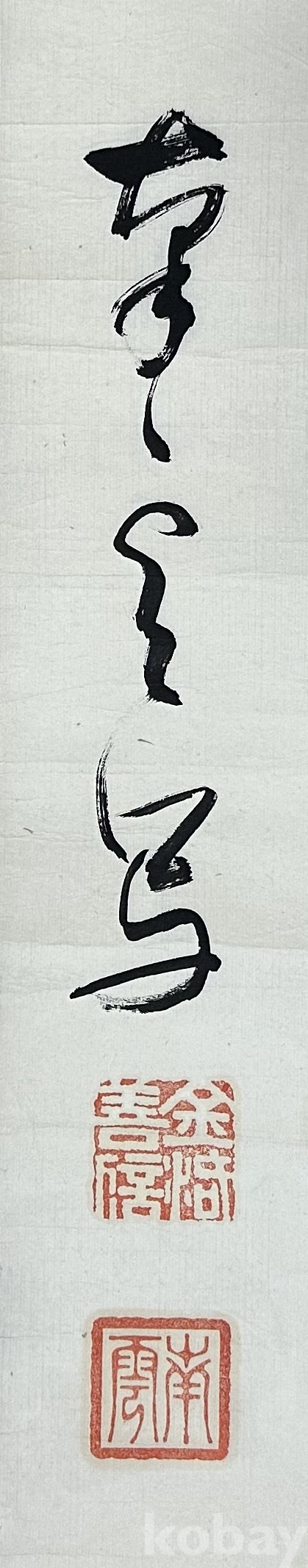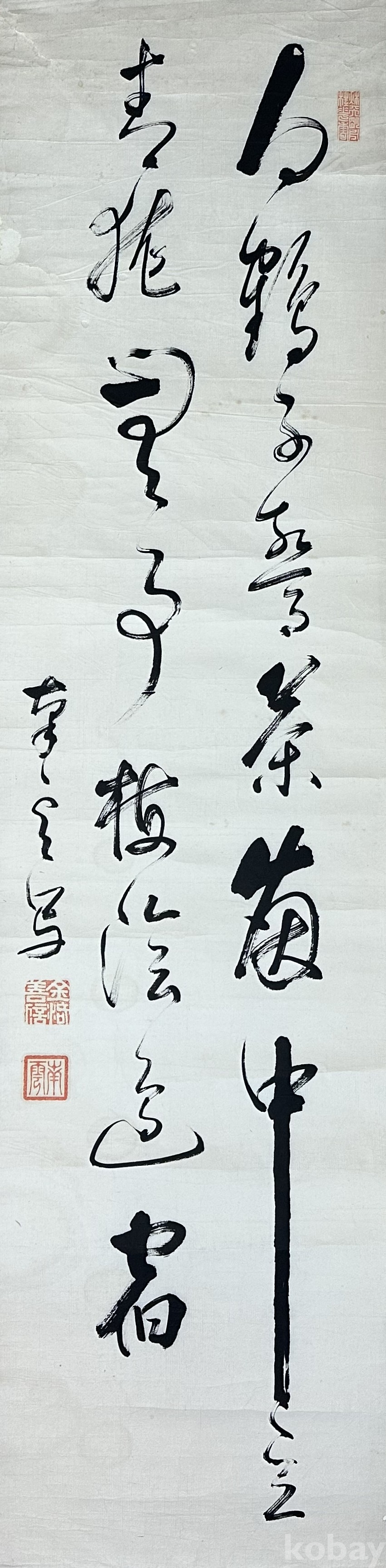 세로로 긴 화면 구성의 초서 서예 작품입니다. 힘 있는 필획과 유려한 운필이 돋보이며, 화면 상단과 하단에 낙관이 확인됩니다. 서체의 흐름이 자연스럽고 여백 활용이 좋아 장식성과 감상성이 함께 느껴지는 작품입니다. 서예, 고서화, 문방 취미 수집용으로 권장드립니다.