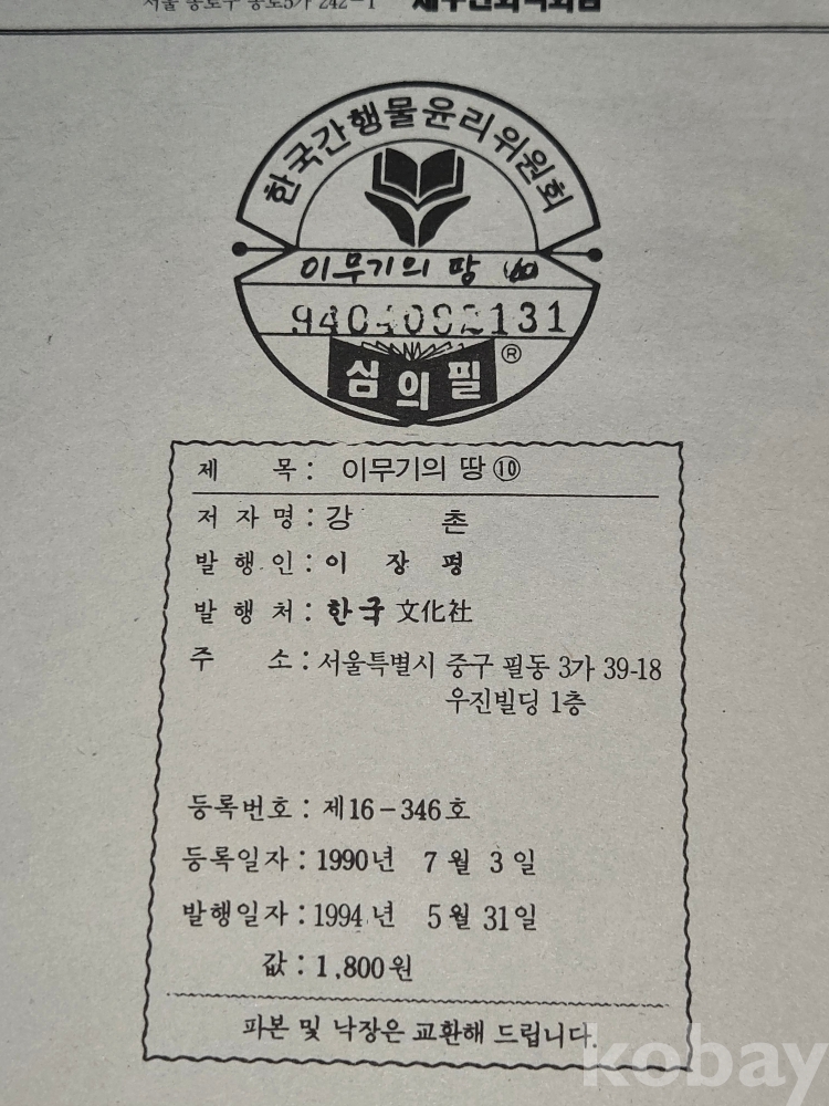추억의 만화방 ==1994년 발행 / 강촌 글.그림 = 이무기의 땅= 10권 완질